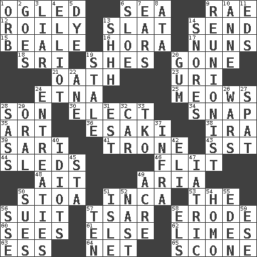 ACROSS 1. Stared at amorously 6. Ocean 9. Actress Charlotte 12. Turbulent 13. Narrow board 14. Post 15. Calif. Air Force Base 16. Israeli folk dance 17. Religious women 18. _ Lanka 19. "______ My Girl" (Turtles hit) 20. Went 21. Pledge 23. RI univ. 24. Inactive volcano in Sicily 25. Catcalls? 28. Male offspring 30. Voters do this 34. Fastener 35. Nonscientific branch of learning 36. 1973 Nobel Price Winner (Physics) Leo 38. Retirement account (abbr.) 39. Indian skirt 41. Heavy duty weighing machine 43. Fast jet (abbr.) 44. Bobsleighs 46. Sudden quick movement 48. Small island 49. Roberta Peters solo 50. Portico 51. South American Indian 53. Definite Article 56. Set of matching outer garments 57. Russian ruler of old 58. Eat (away) 60. Perceives with the eye 61. Otherwise 62. Citrus fruits 63. Curvy letter 64. Fish or hair follower 65. Biscuitlike quick bread DOWN 1. Globe 2. Moves 3. One who doesn't tell the truth 4. American author Paul (1891-1958) 5. Color 6. _ gin 7. Hearing organs 8. _ moment's notice (2 wds.) 9. One who advocates reunion 10. Singer Murray 11. Begley and Asner 13. Quiet! 14. Sounds asleep 19. Lacking originality or spontaneity 20. Chewing product 22. One (Scot) 24. Pleas 26. Armed conflicts 27. Argument over a trivial matter 28. Backtalk 29. Spoken 31. Eastern Standard Time (abbr.) 32. Automobile 33. Ring climax 37. Kind of red light 40. Foolish or stupid persons 42. Biblical high priest 45. R.R. building 47. Of or pertaining to medicine 49. Measure of real estate 50. Takes to court 51. Capri or Wight 52. Political cartoonist Thomas 54. Like (prefix) 55. Genesis locale 56. Compass dir. 57. "___ Little Indians" 58. Raised railways 59. Compass dir.