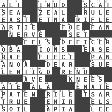 ACROSS 1. Keyboard modifier key 4. Southeast Asian peninsula 8. Scram, to a cat 12. Ocean 13. Ardor 14. Court order 15. Compass direction 17. Inactive volcano in Sicily 18. Ransack; plunder; pillage 19. Nick name for Arthur 21. Enemy 23. Avid follower 24. Effrontery 26. Arrange properly for use 28. Snakelike fish 30. Person of authority 34. Chief or king in Benin or Nigeria 37. Charged particles 39. Comfort 40. Actress Charlotte 41. Opt 43. Baking dish 44. Small Philippine buffalo 46. Letter starter 47. Take to court 48. Small, flat, pigmented spot on the skin 51. Tear apart 54. "___ Maria" 55. Leg joints 58. Had dinner 61. According to 63. Related on the mother's side 65. Eucharist need 67. Cause heat under the collar 71. Russian ruler of old 72. Loyal 73. Independent ruler or chieftain 74. Raised railways 75. Land 76. Capital of Western Samoa 77. Area sheltered from the wind DOWN 1. Toward the sea 2. Acquire or gain knowledge or skills 3. Clothes sense 4. Ending with capital 5. Fish or hair follower 6. One of the 12 tribes of Israel 7. Norwegian king 8. Indian title of respect (Mr.) 9. Sleeve end 10. Silent film actress Nazimova 11. Adolescent 16. Become fatigued 18. Coral ridge 20. First lady 22. Order of Saint Francis (abbr.) 25. Writer Wiesel 27. Make a knot 29. Twentieth part of a lira 30. Witty Wilde 31. Smile enhancers 32. He sold his birthright 33. French philosopher Descartes 34. Spoken 35. Object of repulsion 36. A really long time 38. Born 42. Long journey 45. "One Day ___ Time" 49. "Terrible" tsar 50. Set 52. Compass dir. 53. Undesirable depression on a surface 56. Artist's stand 57. Lacking originality or spontaneity 58. Flats, for short 59. Pacific island yam 60. Needle holder 62. Length times width 64. Celtic language 66. Snakelike fish 68. Mischievous child 69. Cards in a Roman deck? 70. Period