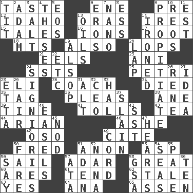 ACROSS 1. Clothes sense 6. Compass dir. 9. Before (prefix) 12. Potato state 13. Mouths or openings 14. Angers 15. Lies 16. Charged particles 17. Carrot, for example 18. Mountains (abbr.) 19. In addition 20. Chops off 21. Snakelike fish 23. Black tropical American cuckoo 24. Fast planes 25. _ dish (used to culture cells) 28. Connecticut Ivy Leaguer 30. Team commander 34. Passed on 35. Label 36. Entreaties 38. A saturated hydrocarbon 39. Prong on a fork 41. For Whom the Bell _____ 43. Afternoon social gathering 44. Believer in; advocate of (suffix) 46. American tennis player Robert 48. Bear (Spanish) 49. Quote 50. Flintstone 51. At once, immediately (arch.) 53. Viper 56. Travel by water 57. The sixth month of the Jewish calendar 58. Relatively large 60. Ancient Greek god of war 61. Watch over 62. Showing deterioration from age 63. It is so 64. Santa ___, CA 65. NE Netherlands city DOWN 1. Teat (slang) 2. First man 3. Table seasoning 4. College papers 5. Greek goddess of the dawn 6. Greek god of love 7. Billionth: prefix 8. Curvy letter 9. Appease 10. Vintage cars 11. Eastern Standard Time (abbr.) 13. Lubricates 14. Pressed 19. Columnist Joseph or Stewart 20. Infant locale 22. And so on (abbr.) 24. Seigniories (variant) 26. French philosopher Descartes 27. It may be bright or harebrained 28. Singer James 29. Den 31. The first octave above the treble staff 32. Corporate head (abbr.) 33. Actor Linden 37. Killed 40. Artist's stands 42. Fast jet (abbr.) 45. Dreamland 47. Centers 49. Drawstring 50. Conductor's collection 51. Arabian gulf 52. Nanny 54. Oceans 55. Light colored 56. Declare 57. "One Day ___ Time" 58. Girls' org. (abbr.) 59. "___ Little Indians"