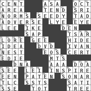ACROSS 1. Penny 5. White ___ sheet 8. Sep. follower 11. Length times width 12. Look after 14. _ Lanka 15. Typical standards 17. Morally degraded 18. Bit 19. Contrary to your interests or welfare 21. Potassium hydroxide 22. Sight organ 23. Area sheltered from the wind 24. Eisenhower's nickname 25. Lair 27. Plant excrement 28. Russian ruler of old 31. Old wives' tales, e.g. 35. Turn to the right 37. Flintstone garb 38. It may be bright or harebrained 39. Movie disc 41. "Terrible" tsar 42. A home for chicks 43. Greek goddess of the dawn 45. An absolute certainty 46. Singer Brickell 47. Mountains (abbr.) 49. Heredity factor (abbr.) 51. American Automobile Association (abbr.) 52. ___ good deed 55. Observe 57. Flowery wreath 60. Stimulate to action 62. Car or cant ending 63. Eucharist need 65. Echolocation 66. Affectionate concern, for short 67. Fast planes 68. Suttee (variant) 69. Compass dir. 70. Small child 71. Relationship diagram DOWN 1. Lessep's creation 2. Eat (away) 3. Effrontery 4. Not wild 5. Had dinner 6. Sew up the eyelids of hawks and falcons 7. "60 Minutes" Commentator Rooney 8. Clearly or manifestly demonstrative 9. Supercomputer manufacturer 10. Event that recurs at intervals 13. Colored 16. Indian titles of respect 17. Oozed 20. Heroin 26. Value system 29. The sixth month of the Jewish calendar 30. Monthly bill 31. Actor's bit 32. Wrote a lyric poem 33. Home 34. Ingested 36. Night before a holiday 40. Kingdom 44. Comedian Laurel of Laurel & Hardy 48. Backtalk 50. High mountains 52. Middle Eastern gold or silver currency 53. Declaim 54. Nest on high 55. Arranges properly for use 56. Snakelike fish 58. 90 degrees 59. "Tell ____ the Marines!" 61. Mail 64. Eastern Standard Time (abbr.)
