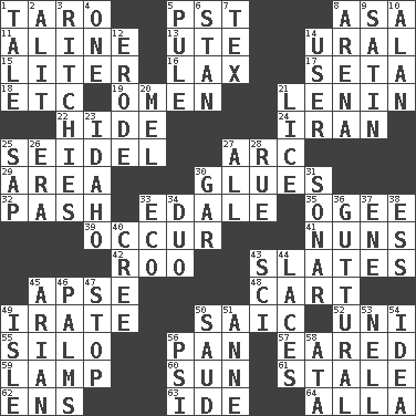 ACROSS 1. Edible starchy tuberous root 5. Pacific Standard Time (abbr.) 8. White ___ sheet 11. Place in a line 13. Shoshoni 14. Mountain range 15. 61 cubic inches 16. Not strict 17. Bristle 18. And so on (abbr.) 19. Sign of things to come 21. Soviet premier 1918-24 22. Flintstone garb 24. SW Asia republic 25. Beer mug 27. Curve 29. Length times width 30. Adhesives 32. Romantic infatuation 33. Peak District village in England 35. Double curve, resembling the letter S 39. Happen 41. Religious women 42. Friend of Pooh 43. Chalkboards 45. Domed church section 48. Haul 49. Feeling or showing extreme anger 50. Ketch in the Levant 52. Corn or form start 55. Grain storage tower 56. Baking dish 57. Having ears or earlike features 59. Desk light 60. Player for Phoenix 61. Having lost freshness 62. Followers of ems 63. Binary compound 64. Silent film actress Nazimova DOWN 1. Falsehood 2. Set down 3. Actors Guy, Robert Welles, and Clint 4. Single 5. Whimper 6. Comedian Laurel of Laurel & Hardy 7. John Ritter's dad 8. Sports stadium 9. Smooth fabric 10. Actor Alda or Thicke 12. Eat (away) 14. One who uses or employs something 20. Cartoonist voice _ Blanc 21. Louse (plural) 23. Potato state 25. Plant excrement 26. Epoch 27. 100% 28. Regret 30. Slender fish 31. Underwater navigation system 33. Environmental prefix 34. Superhero pair 36. From the throat 37. Compass dir. 38. Curvy letter 40. Algonquian 43. _-fi 44. Shoestrings 45. Believer in; advocate of (suffix) 46. Insides of hands 47. Discontinue 49. Capri or Wight 50. Saudi Arabian king (1953-1964) 51. Queen of England 1702-14 53. 1994 drama film starring Jodie Foster 54. It may be bright or harebrained 56. 23rd letter of the Greek alphabet 58. "One Day ___ Time"