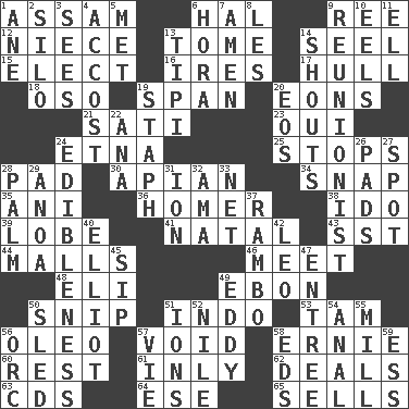 ACROSS 1. Indian state 6. Actor Linden 9. Portuguese money of account (variant) 12. Sibling's daughter 13. Heavy book 14. Stitch closed the eyes of (a falcon) 15. Opt 16. Angers 17. Frame or body of a ship 18. Bear (Spanish) 19. Connect, as a bridge 20. Immeasurably long periods of time 21. Suttee (variant) 23. Fr. "Yes" 24. Inactive volcano in Sicily 25. Ceases 28. Writing tablet 30. Bee-related 34. Fastener 35. Black tropical American cuckoo 36. Home run 38. Wedding promise 39. Ear part 41. Brizilian seaport 43. Fast jet (abbr.) 44. Promenades 46. Confront 48. Connecticut Ivy Leaguer 49. Inky black, to poets 50. Clip 51. _ china 53. Scottish cap 56. Margarine 57. Lacking any legal or binding force 58. Bert's buddy 60. Respite 61. Inwardly 62. Allots cards 63. Music discs 64. Compass dir. 65. Makes a sale DOWN 1. One (Scot) 2. Grain storage tower 3. Perceives with the eye 4. Buttonhole 5. Was introduced to 6. Israeli folk dance 7. So be it 8. French article 9. One who advocates reunion 10. Snakelike fish 11. Pipe bend 13. Native american tent (variation) 14. Yells 19. Staphylococcus 20. Greek goddess of the dawn 22. Santa ___, CA 24. The property of being fit to eat 26. Writing tablets 27. Specific locale 28. Inside of hand 29. Small Philippine buffalo 31. Electrically charged atom 32. Nursemaid (var.) 33. Remaining after all deductions 37. Role for Stallone 40. American author Paul (1891-1958) 42. Lion 45. Small drink 47. Main course 49. Whirlpool 50. Downhill vehicle 51. Charged atoms 52. Mediterranean tributary 54. Of or related to the anus 55. Place where flour is made 56. The grampus (Milton) 57. Compete 58. Begley and Asner 59. Curvy letter