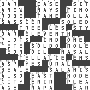 ACROSS 1. Drinking establishment 4. Relaxation 8. Be seated 11. Afresh 13. Negative votes 14. Fine (Spanish) 15. Loose flowing garment 16. Docile 17. Spanish pot 18. More impudent 21. Having a sole or soles 22. Family _ (genealogy) 23. French article 25. Filthy place 26. Rowing implement 29. Veterans Day date 32. Schemes 34. Indiana (abbr.) 35. Single 38. False hair 39. Twentieth part of a lira 41. Hero or heavy, e.g. 43. Period of immesurable duration 44. Lubricate 45. Relating to the nose 46. Copy Pinocchio 50. Followers of ems 51. Cleo's killer 54. Affirmative reply 55. Mountain range 57. Calif. Air Force Base 59. Deli grouping 63. In addition 64. Compass direction 67. Method 68. Municipality 69. Independent ruler or chieftain 70. Entreaty 71. Mature 72. California wine valley 73. Ewer handle DOWN 1. Taverns 2. Small Philippine buffalo 3. Confederate soldiers (slang) 4. Main course 5. Auto club (abbr.) 6. Symbol (abbr.) 7. Compass dir. 8. Beverly of Met fame 9. An arm off of a larger body of water 10. Sycophant 12. 270 degrees 14. Egg _ yung 19. Angers 20. Snakelike fish 21. Fast jet (abbr.) 23. Grant temporary use of 24. Inside; within (prefix) 26. Elect 27. Toward shelter 28. Printing process, for short 30. Country estate 31. Israeli folk dance 33. Portable shelter 36. Sense of smell 37. Flair 39. Not divided or shared with others 40. Petroleums 42. Raised railways 45. Be tempered by heat 47. Sight organ 48. A period of five years 49. Retirement account (abbr.) 51. Phillipine bananalike plant 52. Major League Baseball Commissioner Bud 53. Thick mixture 56. Desk light 58. Myrna of the movies 60. Undercover agent 61. The main thing one is thinking about 62. Scorch 64. Car or cant ending 65. Wet nurse (var.) 66. Small drink