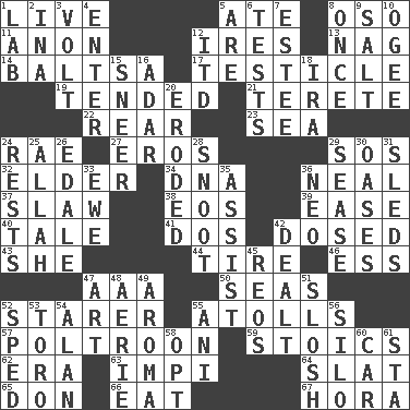 ACROSS 1. Not recorded 5. Had dinner 8. Bear (Spanish) 11. At once, immediately (arch.) 12. Angers 13. Tired old horse 14. Greek mezzo-soprano Agnes 17. A testis 19. Looked after 21. Cigar-shaped 22. Located in or toward the back 23. Ocean 24. Actress Charlotte 27. Greek god of love 29. Mayday 32. A person who is older than you are 34. Heredity factor (abbr.) 36. Anneal 37. Cole _ (cabbage dish) 38. Greek goddess of the dawn 39. Relaxation 40. Falsehood 41. Two (Sp.) 42. Administered medicine 43. A female animal or person 44. Hoop that covers a wheel 46. Double-curved letter 47. American Automobile Association (abbr.) 50. Oceans 52. A viewer who gazes fixedly 55. Ringlike coral islands and reefs 57. Coward 59. Unemotional ones 62. Period 63. Body of Kaffir warriors 64. Narrow board 65. Spanish title 66. Erode 67. Israeli folk dance DOWN 1. Experiment locale 2. _ tizzy (2 wds.) 3. Electrical Unit 4. Keyboard key 5. "We ___ not amused" (Victoria) 6. Trials 7. First name in cosmetics 8. Single time 9. Table seasoning 10. Double curve, resembling the letter S 12. It would 15. Contemptuous expression 16. The sixth month of the Jewish calendar 18. Lyricist Gershwin 20. Worn away 24. Musical pauses 25. Assad's deity 26. Peak District village in England 28. Snob 29. Gospel singer Marvin 30. Fertile tracts in a desert 31. Bobsleighs 33. She-sheep 35. Aid 36. Modern: prefix 42. Started a card game 45. Vintage cars 47. Nonscientific branch of learning 48. Nest on high 49. Scent 51. Agitate, as a liquid 52. Hurried 53. "Corrida" creature 54. Actor Alda or Thicke 55. Cuckoo 56. Grain storage tower 58. Choose 60. 4-wheeled motor vehicle 61. R.R. building