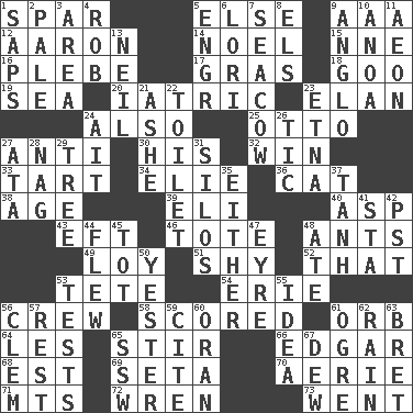 ACROSS 1. Coast Guard woman 5. Otherwise 9. American Automobile Association (abbr.) 12. Composer Copland 14. Christmas carol 15. Compass dir. 16. Cadet 17. Pate de foie ____ 18. Thick or sticky substance 19. Ocean 20. Of or pertaining to medicine 23. Flair 24. In addition 25. Von Bismarck 27. Opposed to 30. Part of HMS, perhaps 32. Acquire through effort 33. Small pie 34. Writer Wiesel 36. Domesticated feline 38. Mature 39. Biblical high priest 40. Viper 43. Bank Draft (abbr.) 46. Carryall 48. Pismires 49. Myrna of the movies 51. Like a shrinking violet 52. Not this but _ 53. Wig 54. 4th largest of the Great Lakes 56. Ship's personnel 58. Tallied 61. Globe 64. French article 65. Commotion 66. _ Allan Poe 68. Eastern Standard Time (abbr.) 69. Bristle 70. Nest on high 71. Mountains (abbr.) 72. Songbird 73. Gone DOWN 1. Plant excrements 2. Light colored 3. Length times width 4. Director Reiner 5. Engineer (abbr.) 6. Australian parrot (variant) 7. Manatee 8. Raised railways 9. White American of non-Hispanic descent 10. Small Philippine buffalo 11. A really long time 13. Famous astronaut Armstrong 21. American tennis player Robert 22. Bathroom plumbing fixture 23. Inactive volcano in Sicily 24. Small island 26. Nervous spasm 27. _ moment's notice (2 wds.) 28. Tired old horse 29. Relationship diagram 31. Grain storage towers 35. One or the other 37. Hyperbolic tangent 41. R.R. building 42. Pacific Standard Time (abbr.) 44. Soared 45. Small child 47. Jane of fiction 48. Had dinner 50. Next before 53. Trials 55. It may be bright or harebrained 56. Clement's nick name 57. Remainder 59. Quote 60. Northwest Algerian city 61. Legendary monster 62. Water falling in drops from the sky 63. Cy Young winner Saberhagen 65. Compass dir. 67. Morning condensation