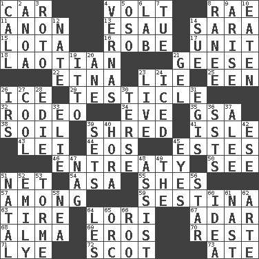 ACROSS 1. 4-wheeled motor vehicle 4. Electrical Unit 8. Actress Charlotte 11. Soon (poet.) 13. He sold his birthright 14. "Two Mules for Sister ____" 15. Globular water bottle used in Asia 16. Loose flowing garment 17. A single undivided whole 18. Of or relating to Laos or its people 21. Honkers 22. Inactive volcano in Sicily 23. Falsehood 25. Car or cant ending 26. Frozen water 29. A testis 32. Cowboy competition 34. First lady 35. Girls' org. (abbr.) 38. Earth 39. Fragment 41. Capri or Wight 43. Luau accessory 44. Greek goddess of the dawn 45. _____ Park, CO 46. Plea 50. Perceive with the eye 51. Fish or hair follower 54. White ___ sheet 55. "______ My Girl" (Turtles hit) 57. Amid 59. French poetic form 63. Become fatigued 64. Australian parrot (variant) 67. The sixth month of the Jewish calendar 68. _ mater 69. Greek god of love 70. Repose 71. Sodium hydroxide 72. Native of Scotland 73. Had dinner DOWN 1. Give a ring to 2. Small Philippine buffalo 3. Printing process, for short 4. Actresses Bloom and Felton 5. Bear (Spanish) 6. Experiment locale 7. Third day of the wk. 8. Indian princess (variant) 9. Ascend 10. Eroded 12. Nathan's nickname 14. Take to court 19. "Tell ____ the Marines!" 20. One (Scot) 21. Set 23. Not recorded 24. On the rocks 26. Big collection agency 27. Calm and collected 28. Singer Brickell 30. Laconic 31. Armor plate that protects the chest 33. Writer Wiesel 36. Fast planes 37. Toward shelter 39. Arranges properly for use 40. Israeli folk dance 42. Compass dir. 45. Snake ____ (dice throw) 47. Tired old horse 48. Help 49. Definite Article 51. Relating to or accompanying birth 52. Poet Dickinson 53. Singer Mel 56. Play the lead 58. Teachers' org. 60. The content of cognition 61. Political cartoonist Thomas 62. Johnson of "Laugh-In" 64. French article 65. The grampus (Milton) 66. Friend of Pooh
