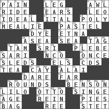 ACROSS 1. Ache 5. Part of a journey 8. Leather borer 11. Travel on an animal 12. Hearing organs 14. Lion 15. Standard of perfection 17. Slanted text style (abbr.) 18. More than one (prefix) 19. Ear of corn 21. Soft color 23. Color 25. Inactive volcano in Sicily 26. Toward the sea 27. Ocean 28. Label 31. Scottish cap 33. _ Lanka 35. Cadet 37. Indian skirt 38. Non-commissioned officer (abbr.) 40. Single time 41. Bobsleighs 43. Raised railways 45. Music discs 46. Beverage made from leaves 47. Island 50. Mountain range southwest of Kyrgyzstan 52. Have the gumption 53. At a great distance 54. Periods in a boxing match 56. Gillaume's butler role 61. _ and Stitch 62. Von Bismarck 65. Burn superficially 66. Ripen 67. It's straight from the horse's mouth 68. Sliced desserts 69. Paper or plastic container 70. To separate or throw off 71. Proofreading order DOWN 1. Demure 2. Assistant 3. The main thing one is thinking about 4. Actress Patricia 5. Luau accessory 6. Consume 7. Wine fruits 8. _ vera 9. Not ill 10. Myrna of the movies 13. Schedule 16. Hats (slang) 18. Parent Teacher Assoc. 20. Snake ____ (dice throw) 22. Fastener 24. Merit 26. Among 28. Look after 29. Lettered men learn these first 30. Turn to the right 31. Lie 32. Length times width 34. Frozen water 36. Event scenes 37. Fast jet (abbr.) 39. Norwegian king 42. Examine hastily 44. Thick slice 48. Zeal 49. Of or pertaining to yesterday 51. Ancient Greek god of war 52. Superhero pair 54. Port city in Latvia 55. Cassini of fashion 57. Pinches, bites 58. In a ____ (agitated or irritated) 59. Double curve, resembling the letter S 60. A home for chicks 61. Experiment locale 63. Neckwear 64. Single