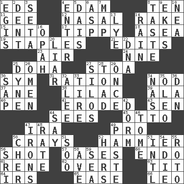 ACROSS 1. Begley and Asner 4. Dutch treat 8. "___ Little Indians" 11. Turn to the right 12. Relating to the nose 14. Immoral or dissolute person 15. To the inside or interior of 17. Likely to tip or tilt 18. At sea 19. Paper fasteners 21. Proofreads 23. Atmosphere 24. Compass dir. 25. Capital of the state of Qatar 27. Portico 30. Symbol (abbr.) 31. Food allowance for one day 34. Lower and raise head in agreement 37. One (Scot) 38. Pale purple color 39. According to 40. Animal enclosure 41. Eaten away 43. Elected rep. 44. Observes 45. "Beetle Bailey" pooch 47. Lyricist Gershwin 49. Adept person 50. Trading vessels 52. More given to overacting 56. Attempt 57. Fertile tracts in a desert 60. Inside; within (prefix) 61. French philosopher Descartes 62. Unconcealed 63. Teat (slang) 64. Big collection agency 65. Relaxation 66. Lion DOWN 1. The front part of a cuirass 2. Undesirable depression on a surface 3. Stalk of a moss capsule 4. Keyboard key 5. Raised platform 6. Cleo's killer 7. Atlas unit 8. Clothes sense 9. Makes supply last 10. Teachers' org. 13. Sodium hydroxide 14. Water falling in drops from the sky 16. Brightly colored fish 20. One who doesn't tell the truth 22. Heredity factor (abbr.) 25. Centimeter-gram-second unit of force 26. Sign of things to come 27. Grain storage towers 28. Frog relative 29. Single time 30. Plant excrement 32. Toward shelter 33. Become fatigued 34. Political cartoonist Thomas 35. Margarine 36. One of the 12 tribes of Israel 42. Dormintory (informal) 44. Declare 46. Heavy book 47. Metal shackles 48. Pace 49. Thick mixture 50. "Mermaids" star 51. "Barney Miller" actor Jack 52. Possessive pronoun 53. International (abbr.) 54. Singer Brickell 55. Printing process, for short 56. _ Lanka 58. "___ Maria" 59. Ocean