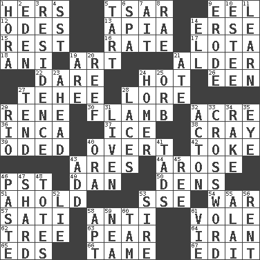 ACROSS 1. Possessive pronoun 5. Russian ruler of old 9. Snakelike fish 12. Lyric poems 13. Capital of Western Samoa 14. Celtic language 15. Take ten 16. Assign a rank or rating to 17. Globular water bottle used in Asia 18. Black tropical American cuckoo 19. Nonscientific branch of learning 21. Tree or shrub in the Birch family 22. Have the gumption 24. Being at a high temperature 26. Car or cant ending 27. Giggle 28. Old wives' tales, e.g. 29. French philosopher Descartes 30. Flambe (short form) 32. 43,560 square feet 36. South American Indian 37. Frozen water 38. Supercomputer manufacturer 39. Wrote a lyric poem 40. Unconcealed 42. Puff or smoke 43. Ancient Greek god of war 44. Came up 46. Pacific Standard Time (abbr.) 49. One of the 12 tribes of Israel 50. Habitations of wild animals 51. Hold, grip (Informal) 53. Compass dir. 54. Armed conflict 57. Suttee (variant) 58. Against 61. Grand slam 62. Family _ (genealogy) 63. Lightbulb-shaped fruit 64. SW Asia republic 65. Begley and Asner 66. Not wild 67. Prepare for publication DOWN 1. Israeli folk dance 2. Paradise 3. Home 4. Fast jet (abbr.) 5. Small pie 6. Health resort 7. Small island 8. Actress Charlotte 9. Eat (away) 10. First name in cosmetics 11. Acquire or gain knowledge or skills 14. Pipe bend 19. "We ___ not amused" (Victoria) 20. Coral ridge 21. Had dinner 23. At or in the front 24. Baseball hit which scores a run 25. Globe 27. Look after 28. Shoestrings 29. River (Sp.) 31. Make or become more lively 32. 13-14th century defensive garment 33. What you're doing now 34. Libertine 35. Sight organ 40. Mouth or opening 41. Bits 43. Say or write further 45. To sift 46. Thick mixture 47. Broken piece 48. Hauls 52. Untruth 53. Father 55. Jai _ 56. Monthly bill 58. Fitting 59. Teachers' org. 60. Scottish cap 61. Compete