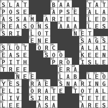ACROSS 1. Narrow board 5. Sound made by sheep 8. Make lace 11. Airs 12. Domed church section 14. In the manner of 15. Indian state 17. Satellite of Uranus 18. Directed 19. Thinks logically 21. American Automobile Association (abbr.) 22. French article 23. _ Lanka 24. Car dealer's back yard 25. Fish or hair follower 27. Compass dir. 28. Sinks 31. Narrow opening 35. The grampus (Milton) 37. Jai ____ 38. Comfort 39. "Barney Miller" actor Jack 41. Peachy ____! 42. Heart or essence 43. Adept person 45. Capri or Wight 46. Woody plant 47. Period 49. Born 51. Experiment locale 52. Lion 55. Consenting reply 57. Actress Charlotte 60. Catching in a trap 62. Connecticut Ivy Leaguer 63. Speak pompously 65. "_____ Recall" 66. 54 in ancient Rome 67. Beget 68. False hair 69. Area sheltered from the wind 70. White ___ sheet 71. Ancient Greek god of war DOWN 1. Practice fights 2. Failure 3. Slender Brazilian palm 4. Afternoon social gatherings 5. Soap unit 6. Capital of Western Samoa 7. At sea 8. Baron Munchausen's specialties 9. Toward shelter 10. Small boys 13. Flair 16. Undercover agent 17. Michaelmas daisies 20. Words to Nanette 26. 1973 Nobel Price Winner (Physics) Leo 29. Highlander 30. Trig term 31. Back-to-school mo. 32. Den 33. Clearly or manifestly demonstrative 34. Giggle 36. Police officer (slang) 40. Threatening words 44. NW Algerian seaport 48. Blind as ____ 50. Greek god of love 52. 61 cubic inches 53. Maternal 54. Stares 55. Shout 56. Writer Wiesel 58. Roberta Peters solo 59. Hearing organs 61. Roll call or roster of names 64. Beverage made from leaves