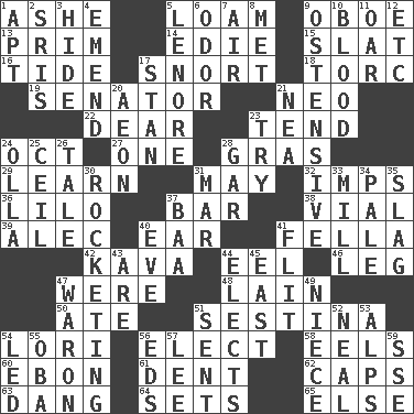 ACROSS 1. American tennis player Robert 5. Rich soil 9. Mitch Miller's instrument 13. Demure 14. Singer Brickell 15. Narrow board 16. Periodic rise and fall of the sea level 17. Derisive sound 18. Torque (variant) 19. Elected representative 21. Modern: prefix 22. Letter starter 23. Watch over 24. Sep. follower 27. Single 28. Pate de foie ____ 29. Memorize 31. Fifth month 32. Naughty children 36. _ and Stitch 37. Oblong piece of solid material 38. Small bottle 39. Actor Baldwin 40. Ewer handle 41. Man or boy (slang) 42. Polynesian shrub of the pepper family 44. Snakelike fish 46. Part of a journey 47. We are 48. (Had) reclined 50. Had dinner 51. French poetic form 54. Australian parrot (variant) 56. Voters do this 58. Snakelike fish 60. Inky black, to poets 61. Gouge 62. Balmoral and tarboosh 63. Mild oath, euphamism for damn 64. Puts into a specified state 65. Otherwise DOWN 1. Fitting 2. Indian titles of respect 3. Flintstone garb 4. Make improvements or corrections to 5. Poe poem 6. Scent 7. Wind 8. Was introduced to 9. Clearly or manifestly demonstrative 10. Vital fluid 11. Boat paddle 12. And so on (abbr.) 17. Comedian Laurel of Laurel & Hardy 20. A really long time 21. Teachers' org. 23. Attempt to accomplish something 24. Spanish pot 25. To provide with a ceiling 26. Lie 28. Slender fish 30. Shooting up abruptly 31. Impair 33. Place where flour is made 34. Light colored 35. Volcanic refuse 37. Sound made by sheep 40. First lady 41. Secret move to avoid paying debts 43. "We ___ not amused" (Victoria) 44. Opts 45. 90 degrees 47. Make _____ (do battle with) 49. Sibling's daughter 51. Posted 52. Anneal 53. High mountains 54. Directed 55. Chief or king in Benin or Nigeria 56. Begley and Asner 57. Area sheltered from the wind 59. Compass dir.