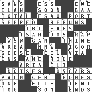 ACROSS 1. Without 5. Curvy letter 8. She-sheep 11. Flair 12. Within a short period 14. Sound made by sheep 15. "_____ Recall" 17. Son of Isaac 18. Left side of a ship or aircraft 19. Oozed 21. Summer TV shows 23. Three (prefix) 25. Nights before holidays 26. Russian ruler of old 27. Two (Sp.) 28. Strike 31. Compass dir. 33. Separate the seeds from cotton 35. One or ones belonging to thee 37. Type of rug 38. Compass dir. 40. Composer Stravinsky 41. Honkers 43. Snakelike fish 45. By way of 46. Followers of ems 47. One (Scot) 50. Travel on or in a vehicle 52. Roberta Peters solo 53. Connecticut Ivy Leaguer 54. Annoying sounds 56. Motion picture awards 61. Inside of hand 62. Sure thing 65. Dwellings 66. Single 67. Writer Wiesel 68. Portable shelter 69. Coat; cloak 70. Boy, to dad 71. Extremities DOWN 1. Puts into a specified state 2. _ vera 3. Nathan's nickname 4. Fastener 5. Compass dir. 6. Mayday 7. Flew 8. Inky black, to poets 9. Armed conflicts 10. Consume 13. New (sp.) 16. Allows 18. Product of festering 20. To be drawn or hauled along 22. Remainder 24. SW Asia republic 26. It was, poetically 28. Swiss mountan, "Queen of the Mountains" 29. Small Philippine buffalo 30. For each 31. Songbird 32. Observes 34. Compass dir. 36. Hub of activity 37. Personal question 39. Past tense of be (plural) 42. Hearing organs 44. _ and Stitch 48. Sibling's daughter 49. Artist's stands 51. Food container 52. Direct toward a target or goal 54. Billionth: prefix 55. Cassini of fashion 57. ____ d'Azur (French Riviera) 58. So be it 59. Tear apart 60. Fast planes 61. Cooking vessel 63. River (Sp.) 64. Nine, plus one