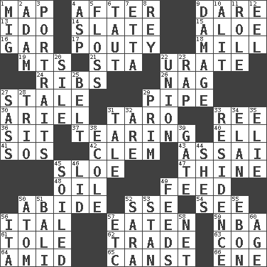 ACROSS 1. Atlas unit 4. Following 9. Have the gumption 13. Wedding promise 14. Schedule 15. _ vera 16. Slender fish 17. Marked by pouting 18. Place where flour is made 19. Mountains (abbr.) 21. R.R. building 22. A salt of uric acid 24. Chest bones 26. Tired old horse 27. Showing deterioration from age 29. Corncob 30. Satellite of Uranus 31. Edible starchy tuberous root 33. To sift 36. Be seated 37. Lacerating 40. Pipe bend 41. Mayday 42. Clement's nick name 43. Slender Brazilian palm 45. A type of plum 47. One or ones belonging to thee 48. Petroleum 49. Nourish 50. Tolerate 52. Compass dir. 54. Observe 56. Slanted text style (abbr.) 57. Ingested 59. Basketball assoc. 61. Lacquered or enameled metalware 62. Barter 63. Gear tooth 64. Among 65. 2nd pers. sing. pres. of can (arch.) 66. Compass dir. DOWN 1. Russian fighter aircraft 2. First man 3. Likenesses of persons 4. Cleo's killer 5. Soft thread for cleaning between teeth 6. Drawn tight 7. Singer James 8. Marina Del _, California 9. Break 10. Set down 11. Hero or heavy, e.g. 12. Snakelike fish 20. Drop; flow; fall 22. The state of being joined or united 23. Strike 25. Waist strap 27. Backtalk 28. Musical group of three 29. Demure 31. Falsehood 32. "We ___ not amused" (Victoria) 33. Home 34. Flair 35. Writer Wiesel 38. Learning spot: Fr. 39. Yard entry 44. "______ My Girl" (Turtles hit) 45. Dirtied 46. Flaplike covering 49. Eats 50. Smallest unit of an element 51. Indonesian resort city 52. "Two Mules for Sister ____" 53. Comedian Laurel of Laurel & Hardy 55. Inky black, to poets 56. Call ___ day 57. And so on (abbr.) 58. Remaining after all deductions 60. Personal question