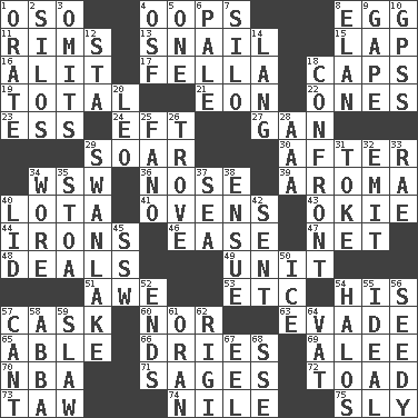 ACROSS 1. Bear (Spanish) 4. I made a mistake 8. Ovum 11. Basketball hoops 13. Slow-paced one 15. Infant locale 16. Set down 17. Chap (slang) 18. Smile enhancers 19. "_____ Recall" 21. A really long time 22. Singles 23. Double-curved letter 24. Bank Draft (abbr.) 27. Separate the seeds from cotton 29. Fly high 30. Following 34. Compass dir. 36. Olfactory organ 39. Scent 40. Globular water bottle used in Asia 41. Baking chambers 43. Migrant worker of the '30s 44. Removes the wrinkles 46. Relaxation 47. Remaining after all deductions 48. Allots cards 49. A single undivided whole 51. Deep reverence 53. And so on (abbr.) 54. Part of HMS, perhaps 57. Keg 60. And not 63. Elude 65. Competent 66. Frees from moisture 69. Toward shelter 70. Basketball assoc. 71. Gurus 72. Frog relative 73. The 23rd letter of the Hebrew alphabet 74. "Death on the ____" 75. Wily DOWN 1. Declaim 2. Grain storage towers 3. Leaves out 4. Order of Saint Francis (abbr.) 5. Single 6. Light colored 7. Grain storage tower 8. Style 9. Open wide 10. Global Positioning Systems (abbr.) 12. R.R. building 14. Austrian-born American filmmaker Fritz 18. Meet 20. Lion 25. Papal veil 26. Collection of objects 28. American Automobile Association (abbr.) 29. Tchaikovsky ballet 31. Puff or smoke 32. Give off 33. Actress Charlotte 34. Had on 35. Portico 37. Ocean 38. Take place subsequently 40. Hat (slang) 42. Emitted 45. Compass dir. 50. Frozen water 52. Extremities 54. Saint headwear 55. Perfect 56. Full of seeds 57. Patter 58. Swedish rock group 59. Cole _ (cabbage dish) 61. NW Algerian seaport 62. Swiss mountan, "Queen of the Mountains" 64. Large container 67. Snakelike fish 68. Compass dir.