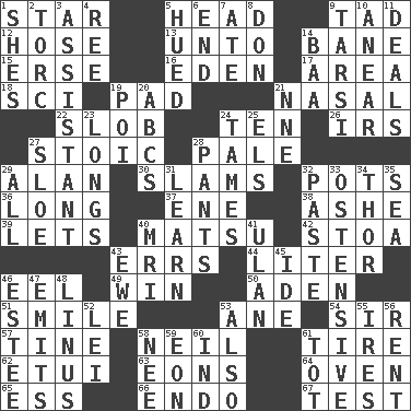 ACROSS 1. Play the lead 5. Froth on beer 9. Bit 12. Stockings 13. To (old English) 14. Object of repulsion 15. Celtic language 16. Paradise 17. Type of rug 18. _-fi 19. Groovy apt. 21. Relating to the nose 22. Messy guy 24. "___ Little Indians" 26. Big collection agency 27. Unemotional 28. Light colored 29. Actor Alda or Thicke 30. Hits or strikes with great force 32. Plant holders 36. Having great length 37. Compass dir. 38. American tennis player Robert 39. Allows 40. Taiwanese island in East China Sea 42. Portico 43. Blunders 44. 61 cubic inches 46. Snakelike fish 49. Victory 50. Arabian gulf 51. Grin 53. One (Scot) 54. Title for a knight 57. Prong on a fork 58. Famous astronaut Armstrong 61. Hoop that covers a wheel 62. Needle case 63. Immeasurably long periods of time 64. Baking chamber 65. Double-curved letter 66. Inside; within (prefix) 67. Trial DOWN 1. "______ My Girl" (Turtles hit) 2. Torque (variant) 3. Helper 4. To sift 5. Became colored 6. Conclude 7. Had dinner 8. Spanish title 9. Tarsus (plural) 10. Approach 11. Allots cards 14. Sound made by sheep 19. Luau course 20. Lettered men learn these first 21. Compass dir. 23. Yearns 24. Softens 25. Raised railways 27. _ gin 28. Leg coverings 29. 100% 31. Acquire or gain knowledge or skills 32. Thick mixture 33. Clearly or manifestly demonstrative 34. Son of Odin 35. Ocean 40. Medical imaging device (abbr.) 41. ____ Bator, Mongolia 43. She-sheep 45. Binary compound 46. First name in cosmetics 47. Sends forth 48. "_ and Lucy" (Charlie Brown theme song) 52. Luau accessory 53. In addition 55. Angers 56. Monthly bill 58. Born 59. A really long time 60. Indiana (abbr.) 61. Small child