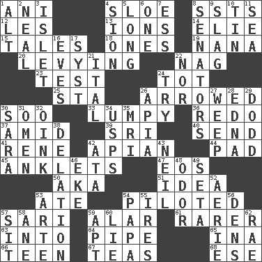 ACROSS 1. Black tropical American cuckoo 4. _ gin 8. Fast planes 12. French article 13. Charged particles 14. Writer Wiesel 15. Falsehoods 18. Singles 19. Grandmother 20. Imposing or collecting, as a tax 22. Tired old horse 23. Trial 24. Small child 25. R.R. building 26. Moved like an arrow 30. "Barney Miller" actor Jack 33. Containing lumps 36. Do over again 37. Among 39. _ Lanka 40. Post 41. French philosopher Descartes 42. Bee-related 44. Groovy apt. 45. Short socks 47. Greek goddess of the dawn 50. Alias (abbr.) 51. It may be bright or harebrained 53. Had dinner 54. Manned the helm 57. Indian skirt 59. Having or resembling wings 61. Less widely known 63. To the inside or interior of 64. Corncob 65. _ tizzy (2 wds.) 66. Adolescent 67. Beverages made from leaves 68. Compass dir. DOWN 1. The first octave above the treble staff 2. Actress Patricia 3. Small island 4. The Jewish people; Israel 5. Yearn 6. Single 7. Curvy letter 8. Legislators 9. Volcanic refuse 10. Metal container 11. Ocean 16. Nights before holidays 17. System (abbr.) 21. Slanted text style (abbr.) 22. Not either 24. Attempt to accomplish something 26. Capital of Western Samoa 27. Shed a tear 28. Pulitzer Prize-winning author Ferber 29. Texas town _ City 30. "Two Mules for Sister ____" 31. Sign of something about to happen 32. Pig sound 34. United States Postal Service (abbr.) 35. Medical imaging device (abbr.) 38. Conveyance 42. _ moment's notice (2 wds.) 43. Famous astronaut Armstrong 46. Make supply last 48. Aroma 49. Bristle 52. Nest on high 53. Johnson of "Laugh-In" 54. Dad 55. Angers 56. Hiding places for outlaws 57. Be seated 58. One (Scot) 59. Fitting 60. Falsehood 62. Actress Charlotte