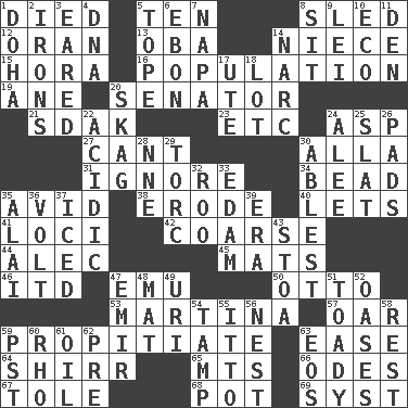 ACROSS 1. Passed on 5. Nine, plus one 8. Downhill vehicle 12. Northwest Algerian city 13. Chief or king in Benin or Nigeria 14. Sibling's daughter 15. Israeli folk dance 16. Census information 19. One (Scot) 20. Elected representative 21. Neighbor of Neb. 23. And so on (abbr.) 24. Viper 27. Patter 30. Silent film actress Nazimova 31. Dismiss 34. Necklace unit 35. Enthusiastic 38. Eat (away) 40. Allows 41. Locales 42. Unrefined 44. Actor Baldwin 45. Floor protectors 46. It would 47. Australian flightless bird 50. "Beetle Bailey" pooch 53. Chrissie's court nemesis 57. Rowing implement 59. Conciliate 63. Relaxation 64. Bake eggs in their shells 65. Mountains (abbr.) 66. Lyric poems 67. Lacquered or enameled metalware 68. Cooking vessel 69. System (abbr.) DOWN 1. Capital of the state of Qatar 2. Removes the wrinkles 3. Having ears or earlike features 4. Heredity factor (abbr.) 5. Drink excessively 6. Inky black, to poets 7. California wine valley 8. Be seated 9. Luau accessory 10. Environmental prefix 11. Lair 14. Drug cop 17. Shoshoni 18. Car dealer's back yard 20. Heroin 22. Being or containing an acid 24. Toward shelter 25. Narrow board 26. Groovy apts. 28. Compass dir. 29. Torque (variant) 30. Most capable 32. Friend of Pooh 33. Dutch treat 35. Jai ____ 36. Electrical Unit 37. On the rocks 39. Epoch 43. Portico 47. Independent ruler or chieftain 48. Floor protector 49. RI univ. 51. Sycophant 52. Fertile tracts in a desert 54. Pack (down) 55. "Tell ____ the Marines!" 56. A home for chicks 58. State of inaction 59. Pacific Standard Time (abbr.) 60. 17th letter of the Greek alphabet 61. Lubricate 62. Before (prefix) 63. Greek goddess of the dawn