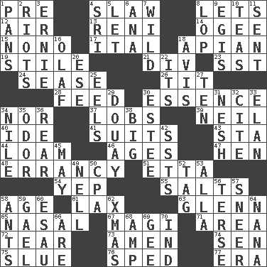ACROSS 1. Before (prefix) 4. Cole _ (cabbage dish) 8. Allows 12. Wind 13. Painter Guido (1575-1642) 14. Double curve, resembling the letter S 15. Words to Nanette 17. Slanted text style (abbr.) 18. Bee-related 19. Vertical member of a panel or frame 21. HTML Container Element 23. Fast jet (abbr.) 24. Gospel singer Marvin 26. Teat (slang) 28. Nourish 30. Center 34. And not 37. Tennis shots 39. Famous astronaut Armstrong 40. Binary compound 41. Sets of matching outer garments 43. R.R. building 44. Rich soil 46. Grows older 47. Layer 48. Tendancy to err 51. Singer James 54. Slangy assent 55. Table seasonings 58. Personal question 61. Not strict 63. American astronaut and politician John 65. Rhinal 67. Wise men 71. Type of rug 72. Separate forcefully 73. So be it 74. Elected rep. 75. Change direction abruptly 76. Hurried 77. Epoch DOWN 1. Zero-star reviews 2. Disturbances 3. Bert's buddy 4. _ Lanka 5. Allow 6. Santa ___, CA 7. Uncontrolled 8. Trim (branches) 9. Armor plate that protects the chest 10. Afternoon social gatherings 11. Transmitted 16. Norwegian king 18. Deliberation 20. Compass dir. 22. It is 25. Snakelike fish 27. Nine, plus one 29. A city in N France, SE of Calais 30. First name in cosmetics 31. Tender 32. Quote 33. Flair 34. "Death on the ____" 35. Aroma 36. Tail end 38. Of large size 42. Fast planes 45. Can I? 49. 1994 drama film starring Jodie Foster 50. Accounting whiz (abbr.) 52. Label 53. Silent film actress Nazimova 56. Laconic 57. Scornful expression 58. Pismires 59. Highlander 60. He sold his birthright 62. Dec. holiday 64. Grandmother 66. "We ___ not amused" (Victoria) 68. Electrical Unit 69. Unit of force equal to gravity 70. Working for oneself (abbr.)