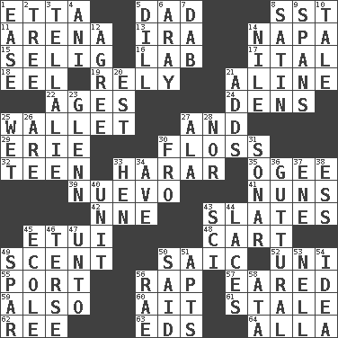 ACROSS 1. Singer James 5. June honoree 8. Fast jet (abbr.) 11. Sports stadium 13. Retirement account (abbr.) 14. California wine valley 15. Major League Baseball Commissioner Bud 16. Experiment locale 17. Slanted text style (abbr.) 18. Snakelike fish 19. Trust 21. Place in a line 22. Matures 24. Habitations of wild animals 25. Place for singles 27. Also 29. 4th largest of the Great Lakes 30. Soft thread for cleaning between teeth 32. Adolescent 33. Ethiopian city, capital of Harari 35. Double curve, resembling the letter S 39. New (sp.) 41. Religious women 42. Compass dir. 43. Chalkboards 45. Needle case 48. Haul 49. Aroma 50. Ketch in the Levant 52. University (slang) 55. Left side of a ship or aircraft 56. Hit sharply and swiftly 57. Having ears or earlike features 59. In addition 60. Small island 61. Lacking originality or spontaneity 62. To separate or throw off 63. Begley and Asner 64. Silent film actress Nazimova DOWN 1. Comfort 2. Family _ (genealogy) 3. Copy Pinocchio 4. Cuckoo 5. Deli pickle 6. Like ___ of sunshine 7. Pat or tap gently 8. Smooth fabric 9. Connects, as a bridge 10. Story 12. Match 14. "Death on the ____" 20. Eastern Standard Time (abbr.) 21. Sums up 23. American astronaut and politician John 25. Dripping 26. "We ___ not amused" (Victoria) 27. In the manner of 28. Not either 30. From 31. Echolocation 33. Layer 34. "___ Maria" 36. From the throat 37. Compass dir. 38. Curvy letter 40. A single undivided whole 43. _-fi 44. Shoestrings 45. Learning spot: Fr. 46. Laconic 47. To (old English) 49. Practice fight 50. Stated 51. Flats, for short 53. 1994 drama film starring Jodie Foster 54. The content of cognition 56. Actress Charlotte 58. _ moment's notice (2 wds.)