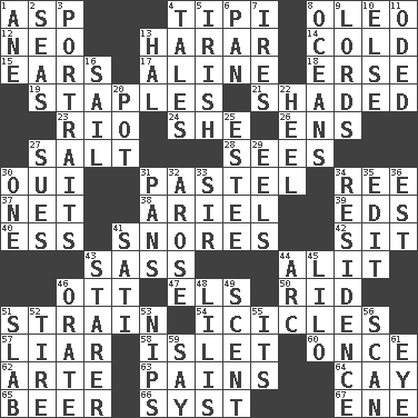 ACROSS 1. Viper 4. Native american tent (variation) 8. Butter sub 12. Modern: prefix 13. Ethiopian city, capital of Harari 14. Lacking warmth 15. Hearing organs 17. Place in a line 18. Celtic language 19. Paper fasteners 21. Cast a shadow over 23. River (Sp.) 24. A female animal or person 26. Followers of ems 27. Table seasoning 28. Perceives with the eye 30. Fr. "Yes" 31. Soft color 34. To riddle 37. Fish or hair follower 38. Satellite of Uranus 39. Begley and Asner 40. Curvy letter 41. Sounds asleep 42. Be seated 43. Backtalk 44. Set down 46. Baseball player Mel 47. Raised railways 50. To free from 51. Put through a sieve 54. Winter's stalactites 57. One who doesn't tell the truth 58. Small island 60. At one time in the past 62. Johnson of "Laugh-In" 63. Aches 64. Island 65. Fermented drink made from hops 66. System (abbr.) 67. Compass dir. DOWN 1. A saturated hydrocarbon 2. Oceans 3. Likenesses of persons 4. Stories 5. From or relating to Ireland 6. Baking dish 7. Angers 8. Seas 9. Domineers 10. Otherwise 11. Wrote a lyric poem 13. Actor Linden 16. Move on water 20. Cooking vessel 22. Person who is morally reprehensible 25. First name in cosmetics 27. Takes to court 29. Snakelike fish 30. Single 31. Zero-star reviews 32. Came up 33. Title for a knight 34. Home 35. Prepare for publication 36. Eastern Standard Time (abbr.) 41. Suttee (variant) 43. A viewer who gazes fixedly 44. Curve 45. _ and Stitch 46. Speak pompously 48. Ms. Damita and namesakes 49. Odor 51. Thick slice 52. Become fatigued 53. Cuts off 55. It is 56. Examine minutely or intensely 59. Declare 61. Sight organ