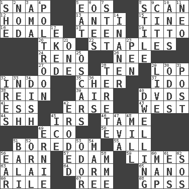 ACROSS 1. Fastener 5. Greek goddess of the dawn 8. Examine hastily 12. Like (prefix) 13. Opposed to 15. Prong on a fork 16. Peak District village in England 18. Adolescent 19. "Tell ____ the Marines!" 20. Ring climax 22. Paper fasteners 24. Western Nevada city 26. Born 27. Lyric poems 28. "___ Little Indians" 29. Trim (branches) 32. Southeast Asian peninsula 35. "Mermaids" star 37. Wedding promise 38. It's straight from the horse's mouth 39. Atmosphere 40. Movie discs 41. Double-curved letter 42. Celtic language 43. 270 degrees 44. Quiet! 45. Big collection agency 46. Not wild 49. Environmental prefix 50. Morally bad or wrong 51. Mood resulting from idleness 55. 100% 56. Merit 57. Dutch treat 59. Citrus fruits 63. Jai _ 64. Dormintory (informal) 65. Billionth: prefix 66. Cause heat under the collar 67. To riddle 68. Global Positioning Systems (abbr.) DOWN 1. A female animal or person 2. Lower and raise head in agreement 3. Nanny (var.) 4. Characterized by complete cowardliness 5. Consume 6. Singles 7. Proofreading order 8. Vertical member of a panel or frame 9. Quote 10. Pismires 11. Modern: prefix 14. Sillier 17. Supplemented with great effort 21. Single 23. Writing instrument 25. Motion picture awards 28. Cylindrical with tapered ends 29. Not recorded 30. Likelihood 31. Mail 32. Angers 33. Soft 34. Food container 36. Part of HMS, perhaps 40. Residence 42. Worn away 45. Frozen water 47. Actress Gardner 48. Place where flour is made 49. Bert's buddy 51. Indonesian resort city 52. Taken by mouth 53. Aroma 54. Female horse 56. Hearing organ 58. Madame (abbr.) 60. Atlas unit 61. Followers of ems 62. Distress signal