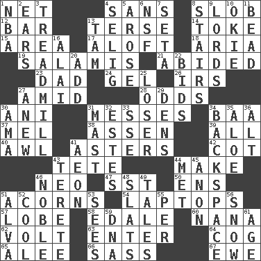 ACROSS 1. Fish or hair follower 4. Without 8. Oscar Madison type 12. Oblong piece of solid material 13. Laconic 14. Puff or smoke 15. Length times width 17. High up in or into the air 18. Operatic vocal solo 19. Deli grouping 21. Tolerated 23. Male parent 24. Set 26. Big collection agency 27. Among 28. Probability 30. Cuckoo 31. Makes clutter 34. Sound made by sheep 37. Cartoonist voice _ Blanc 38. NE Netherlands city 39. 100% 40. Leather borer 41. Michaelmas daisies 42. Small bed 43. Wig 44. Create 46. Modern: prefix 47. Fast jet (abbr.) 50. Followers of ems 51. Oak nuts 54. Portable computers 57. Ear part 58. Peak District village in England 60. Nanny 62. Electrical Unit 63. Keyboard key 64. Gear tooth 65. Toward shelter 66. Backtalk 67. She-sheep DOWN 1. Basketball assoc. 2. Hearing organs 3. Excercise machine 4. Major League Baseball Commissioner Bud 5. Came up 6. Overdraft (abbr.) 7. Bristle 8. Flight of steps 9. Domineers 10. Migrant worker of the '30s 11. Necklace unit 13. Scottish cap 16. Jai _ 20. Say or write further 22. Auction offers 25. Failure 27. Afresh 29. Lairs 30. Nanny (var.) 31. Vertical spar for supporting sails 32. _____ Park, CO 33. Compass dir. 34. Keyboard key 35. _ vera 36. The first octave above the treble staff 41. A really long time 43. Cylindrical with tapered ends 44. Was introduced to 45. At once, immediately (arch.) 46. Having high moral qualities 48. Narrow boards 49. Falsehoods 51. Inventor's middle name 52. Calm and collected 53. Perceives with the eye 55. For each 56. Overwhelm 59. Heredity factor (abbr.) 61. Mature