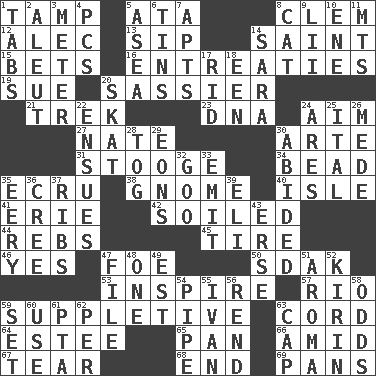 ACROSS 1. Pack (down) 5. _ moment's notice (2 wds.) 8. Clement's nick name 12. Actor Baldwin 13. Small drink 14. Inhabitant of Heaven 15. Antes 16. Pleas 19. Take to court 20. More disrespectful 21. Long journey 23. Heredity factor (abbr.) 24. Direct toward a target or goal 27. Nathan's nickname 30. Johnson of "Laugh-In" 31. Moe Howard, for one 34. Necklace unit 35. Shade of tan 38. Dwarf 40. Capri or Wight 41. 4th largest of the Great Lakes 42. Dirtied 44. Confederate soldiers (slang) 45. Become fatigued 46. It is so 47. Enemy 50. Neighbor of Neb. 53. Stimulate to action 57. River (Sp.) 59. Supplementary 63. Drawstring 64. First name in cosmetics 65. Baking dish 66. Among 67. Rend 68. Conclude 69. Baking dishes DOWN 1. Bar bills 2. Eskimo relative 3. Distance measurement 4. Personal Computers (abbr.) 5. At sea 6. Airtight sealed metal containers 7. Flats, for short 8. Domesticated feline 9. Cards in a Roman deck? 10. Compass dir. 11. Mountains (abbr.) 14. "Two Mules for Sister ____" 17. To free from 18. Car or cant ending 20. Three-handed card game 22. Takes place subsequently 24. Ancient Greek god of war 25. Slanted text style (abbr.) 26. Ancient Persian 28. Coat; cloak 29. Immeasurably long periods of time 30. Stayed 32. Thick or sticky substance 33. Send forth 35. Suggestive of the supernatural 36. Algonquian 37. Teases 39. Connecticut Ivy Leaguer 43. Celtic language 47. Do some clerical work 48. Single 49. Eastern Standard Time (abbr.) 51. Scent 52. Japanese brewing company 54. Corncob 55. _ the terrible 56. Tear apart 58. Probability 59. Put into a specified state 60. Purpose 61. Parent Teacher Assoc. 62. For each 63. Head covering