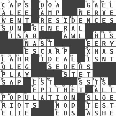 ACROSS 1. Smile enhancers 5. ___ good deed 8. Highlander 12. Toward shelter 13. Electrical Unit 14. Effrontery 15. Gone 16. Dwellings 19. Player for Phoenix 20. Commissioned military rank 21. Russian ruler of old 23. Leather borer 24. Part of HMS, perhaps 27. Political cartoonist Thomas 30. Suggestive of the supernatural 31. Fortification 34. Dec. holiday 35. Cowardly lion portrayer 38. Standard of perfection 40. Is not 41. Cassini of fashion 42. Spring feasts 44. Romp 45. Proofreading order 46. Plant excrement 47. Eastern Standard Time (abbr.) 50. Fast planes 53. Curse 57. The first octave above the treble staff 59. Census information 63. _ gin 64. Disturbances 65. Dreamland 66. Trial 67. Writer Wiesel 68. Begley and Asner 69. American tennis player Robert DOWN 1. Crow sounds 2. Eskimo relative 3. Actor Sean's family 4. Put into a specified state 5. Have the gumption 6. Sign of things to come 7. Domed church section 8. Commissioned mil. rank 9. Curve 10. Night before a holiday 11. French article 14. 1994 drama film starring Jodie Foster 17. Lyricist Gershwin 18. Simpleton 20. Pate de foie ____ 22. Disorder of the immune system 24. Folds over and sews together 25. SW Asia republic 26. System (abbr.) 28. _-fi 29. Small amounts or degrees 30. Is 32. To riddle 33. Writing tablets 35. Chops off 36. Silent film actress Nazimova 37. Pile 39. Allow 43. State of inaction 47. Snakelike fish 48. Health resort 49. Teat (slang) 51. Lies 52. Make a splashing sound 54. Prong on a fork 55. Parka part 56. Extremities 58. Wig 59. Before (prefix) 60. Petroleum 61. Luau course 62. Shoshoni 63. R.R. building