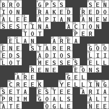 ACROSS 1. Sis' sibling 4. Global Positioning Systems (abbr.) 8. Elected rep. 11. Electrically charged atom 12. Moved through 14. Redecorate 15. Toward shelter 17. Bee-related 18. Afresh 19. French poetic form 21. NE Massachussets city 23. Small child 24. For each 25. Liveliness 27. Length times width 30. Compass dir. 31. A viewer who gazes fixedly 34. Thick or sticky substance 37. Begley and Asner 38. Goodbye (Sp.) 39. Cards in a Roman deck? 40. Car dealer's back yard 41. Makes clutter 43. Pipe bend 44. French philosopher Descartes 45. Immeasurably long periods of time 47. "We ___ not amused" (Victoria) 49. Set 50. Small stream 52. Crying or shouting loudly 56. Bristle 57. First name in cosmetics 60. Roberta Peters solo 61. Demure 62. Purposes of endeavors 63. The first octave above the treble staff 64. Had dinner 65. Stare at amorously 66. Born DOWN 1. Prejudice 2. Hero or heavy, e.g. 3. Singles 4. Monetary aid 5. Dad 6. What Jean-Claude Killy likes to do 7. Ocean 8. Sir (Sp.) 9. Locale of original sin 10. At this time 13. Heredity factor (abbr.) 14. Assign a rank or rating to 16. Singer James 20. Charged atoms 22. Accounting whiz (abbr.) 25. Inside; within (prefix) 26. For fear that 27. Originate 28. Vintage cars 29. Celtic language 30. Snakelike fish 32. Not wild 33. Arabian gulf 34. Small, secluded valley 35. Petroleums 36. Petroleum 42. Sew up the eyelids of hawks and falcons 44. To separate or throw off 46. Water jar 47. Nick name for Arthur 48. 480, 500 or 516 sheets of paper 49. Honkers 50. An absolute certainty 51. Barrel 52. Shout 53. SW Asia republic 54. "Death on the ____" 55. Yard entry 56. Health resort 58. "Barney Miller" actor Jack 59. Label