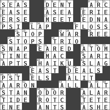 ACROSS 1. Oceans 5. Gouge 9. Curve 12. Comfort 13. Toward the sea 14. One of the Great Lakes 15. Celtic language 16. Rendezvous 17. Pulitzer Prize-winning author Ferber 18. Air pressure measure (abbr.) 19. Infant locale 21. Soft thread for cleaning between teeth 22. Close up, plug up 24. Armed conflict 26. Portuguese money of account (variant) 27. Closes up, plugs up 28. Musical group of three 29. Fastener 30. Having ears or earlike features 32. Tiny particle 36. Prong on a fork 37. Big _ 38. Indian skirt 39. Flats, for short 40. Japanese verse 42. Volcanic refuse 43. Compass direction 44. Allots cards 46. Pacific Standard Time (abbr.) 49. Raised railways 50. Came down and settled, as after flight 51. Composer Copland 53. 100% 54. Keyboard modifier key 57. Comedian Laurel of Laurel & Hardy 58. Aroma 61. Having or resembling wings 62. Event that recurs at intervals 63. College mil. group 64. Wig 65. Compass dir. 66. Pismires 67. American tennis player Robert DOWN 1. Ooze 2. Hearing organs 3. Helper 4. Observe 5. Moist 6. Compass dir. 7. Born 8. Make lace 9. Zeal 10. Wash lightly 11. Desist 14. Snakelike fish 19. Trim (branches) 20. Domed church section 21. Away 23. Drinks excessively 24. Raze 25. Help 27. Clip 28. Distinguishing feature 29. R.R. building 31. Collect or gather 32. Slender Brazilian palm 33. Baron Munchausen's specialties 34. Mouths or openings 35. Russian fighter aircraft 40. Actor Linden 41. Freehold land 43. Car or cant ending 45. Pipe bend 46. Thick mixture 47. Smooth fabric 48. Exchange 52. Single 53. Arches 55. Thin strip of wood or metal 56. Woody plant 58. Mouth or opening 59. Spanish title 60. Baseball player Mel 61. "One Day ___ Time"