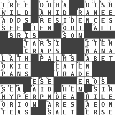 ACROSS 1. Relationship diagram 5. Capital of the state of Qatar 9. Food container 13. Rampant 14. Among 15. Indian princess (variant) 16. Sums up 17. Homes 19. Perceive with the eye 20. "___ Little Indians" 21. Fr. "Yes" 22. The first octave above the treble staff 23. Indian titles of respect 25. Boy, to dad 26. Tarsus (plural) 30. Detail 34. Dice game 35. Grandmother 36. Thin strip of wood or metal 39. Insides of hands 42. Collude with 43. Migrant worker of the '30s 44. Consumed 46. Zero-star reviews 47. Swap 48. Compass dir. 51. Greek god of love 54. Ocean 57. Help 58. Layer 60. Title for a knight 62. Abnormally rapid or deep breathing 65. Cause heat under the collar 66. Constellation of myth 67. Ancient Greek god of war 68. Period of immesurable duration 69. Beverages made from leaves 70. Table seasoning 71. Celtic language DOWN 1. It was, poetically 2. Amusement-park features 3. A person who is older than you are 4. Begley and Asner 5. Have the gumption 6. Presage 7. Part of HMS, perhaps 8. Goodbye (Sp.) 9. One of the 12 tribes of Israel 10. South American Indian 11. Sew up the eyelids of hawks and falcons 12. Command 15. It's straight from the horse's mouth 18. Superhero pair 20. Russian ruler of old 24. Irritating cutaneous sensations 27. Strike 28. Health resort 29. Small island 30. More empty; more void 31. Keyboard key 32. Compass dir. 33. Floor protector 36. Chop off 37. Alias (abbr.) 38. Metal container 40. Make imperfect 41. R.R. building 45. Genesis locale 48. Merit 49. Small drink 50. Ferber et al. 52. Flexible twig of a willow tree 53. Grain storage towers 54. Attempt 55. Jane of fiction 56. Capital of Western Samoa 58. The bottom of a shoe or boot 59. 90 degrees 61. French philosopher Descartes 63. Greek goddess of the dawn 64. Mouth or opening 65. Actress Charlotte