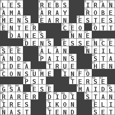 ACROSS 1. French article 4. Confederate soldiers (slang) 8. SW Asia republic 12. Nursemaid (var.) 13. Like ___ of sunshine 14. Loose flowing garment 15. Not women's 17. Merit 18. _____ Park, CO 19. Keyboard key 21. Corporate head (abbr.) 23. Baseball player Mel 24. Natives or inhabitants of Denmark 26. Compass dir. 28. Cub Scout units 30. Core 34. Observe 37. ____ Jay Lerner 39. Famous astronaut Armstrong 40. Plus 41. Aches 43. R.R. building 44. It may be bright or harebrained 46. Loyal 47. Layer 48. Ingest 51. Information 54. Pacific Standard Time (abbr.) 55. Laconic 58. Girls' org. (abbr.) 61. Compass dir. 63. Women servants 65. Less widely known 67. "You Light Up My Life" star Conn 71. Comedian Laurel of Laurel & Hardy 72. Angers 73. Image 74. Biblical high priest 75. Political cartoonist Thomas 76. Be inclined (to) 77. Arrange properly for use DOWN 1. Unable to walk 2. Make improvements or corrections to 3. Before Barbara or Clara 4. Actress Charlotte 5. Period 6. Long, evenly shaped piece 7. Synchronize (abbr.) 8. Big collection agency 9. Printing process, for short 10. Collude with 11. Egg locale 16. Transmit 18. Immeasurably long periods of time 20. To sift 22. Followers of ems 25. Fastener 27. Car or cant ending 29. Chalkboard 30. World-weariness 31. Delicate 32. Quote 33. Liveliness 34. Ketch in the Levant 35. Inside; within (prefix) 36. Paradise 38. Atmosphere 42. Posted 45. Cleo's killer 49. One who makes use of a thing 50. Mountains (abbr.) 52. Opposite of masc. 53. Mouths or openings 56. Settings 57. Peak District village in England 58. Smile widely 59. "Two Mules for Sister ____" 60. Ancient Greek god of war 62. Prepare for publication 64. In a ____ (agitated or irritated) 66. Eastern Standard Time (abbr.) 68. Mamie's husband 69. Spanish title 70. Working for oneself (abbr.)