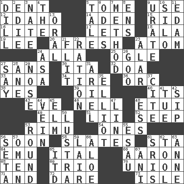 ACROSS 1. Undesirable depression on a surface 5. Heavy book 9. Purpose 12. Potato state 14. An important port of Yemen 15. To free from 16. 61 cubic inches 17. Allows 18. Chicken ___ king 19. Area sheltered from the wind 20. Anew 23. Smallest unit of an element 24. Silent film actress Nazimova 25. Stare 27. Without 30. Call ___ day 32. ___ good deed 33. Small Philippine buffalo 34. Become fatigued 36. The grampus (Milton) 38. Affirmative reply 39. Lubricate 40. ___ a Wonderful Life 43. First lady 46. 1994 drama film starring Jodie Foster 48. Needle holder 49. Pipe bend 51. Cards in a Roman deck? 52. Ooze 53. Tall New Zealand timber tree 54. Washington bills 56. Within a short period 58. Chalkboards 61. R.R. building 64. Australian flightless bird 65. Slanted text style (abbr.) 66. Composer Copland 68. Nine, plus one 69. Musical group of three 70. The state of being joined or united 71. Added to 72. Have the gumption 73. Small island DOWN 1. Deli pickle 2. Singer Brickell 3. Nathan's nickname 4. Definite Article 5. Lie 6. Lyric poems 7. Mode 8. Followers of ems 9. A salt of uric acid 10. Grain storage tower 11. Dutch treat 13. Of the mouth 21. Secret move to avoid paying debts 22. Food allowance for one day 23. Having or resembling wings 24. White ___ sheet 26. Thick or sticky substance 27. Declare 28. A saturated hydrocarbon 29. Olfactory organ 31. Satellite of Uranus 35. American author Paul (1891-1958) 37. Quote 41. Third day of the wk. 42. Small drink 44. Distinctive style or manner 45. Shade tree 47. Actor's bit 48. Curvy letter 50. A period of five years 53. Unit of ammunition 55. Son of Isaac 56. Stalk of a moss capsule 57. Presage 59. Den 60. _ vera 61. Indian titles of respect 62. Utensil 63. Queen of England 1702-14 65. It would 67. Black tropical American cuckoo
