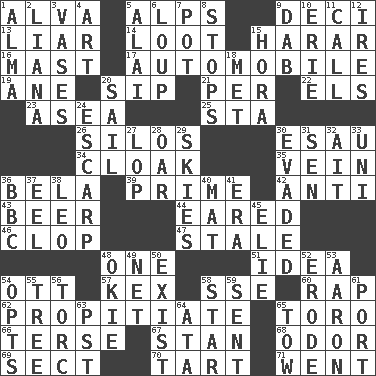 ACROSS 1. Inventor's middle name 5. High mountains 9. Tenth: prefix 13. One who doesn't tell the truth 14. Plunder 15. Ethiopian city, capital of Harari 16. Vertical spar for supporting sails 17. Car 19. One (Scot) 20. Small drink 21. For each 22. Raised railways 23. At sea 25. R.R. building 26. Grain storage towers 30. Son of Isaac 34. Covering 35. Distinctive style or manner 36. Actor Lugosi 39. First class 42. Against 43. Fermented drink made from hops 44. Having ears or earlike features 46. Hoof sound 47. Lacking originality or spontaneity 48. Single 51. The content of cognition 54. Baseball player Mel 57. A weed 58. Compass dir. 60. Strike 62. Appease 65. "Corrida" creature 66. Laconic 67. Comedian Laurel of Laurel & Hardy 68. Scent 69. Religious group 70. Small pie 71. Gone DOWN 1. _ mater 2. Climbing, woody, usually tropical vines 3. Flower holders 4. Tate display 5. Mountain range southwest of Kyrgyzstan 6. Central Nebraska county 7. Cooking vessel 8. Closes up, plugs up 9. Apply (a substance) by light strokes 10. 4th largest of the Great Lakes 11. Give a ring to 12. Angers 15. Israeli folk dance 18. Was introduced to 20. Travel by water 24. Fortification 27. Trim (branches) 28. Rowing implement 29. Atmospheres 30. Eluded 31. Elected rep. 32. Small island 33. Single; one (prefix) 36. English channel? 37. Snakelike fish 38. Lion 40. Floor covering 41. Period 45. Writer Wiesel 48. Migrant worker of the '30s 49. Remaining after all deductions 50. Be extant 52. Eat (away) 53. Composer Copland 54. Chooses 55. Relationship diagram 56. Torque (variant) 58. Play the lead 59. Posted 61. Sweet dark-red dessert wine 63. Pacific Standard Time (abbr.) 64. _ moment's notice (2 wds.) 65. Pull behind