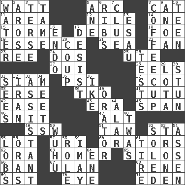 ACROSS 1. Electrical Unit 5. Curve 8. Domesticated feline 11. Length times width 12. The longest river in the world 14. Single 15. Singer Mel 17. To get out of a bus 18. Enemy 19. Gist 21. Ocean 22. Avid follower 23. To separate or throw off 24. Two (Sp.) 25. Shoshoni 27. Fr. "Yes" 28. Snakelike fish 31. Thailand, formerly 35. Air pressure measure (abbr.) 37. Highlander 38. Celtic language 39. Ring climax 41. Ballerina skirt 42. Comfort 43. Period 45. Connect, as a bridge 46. In a ____ (agitated or irritated) 47. The first octave above the treble staff 49. Compass dir. 51. The 23rd letter of the Hebrew alphabet 52. R.R. building 55. Car dealer's back yard 57. RI univ. 60. Speakers 62. Mouth or opening 63. Simpsons dad 65. Grain storage towers 66. Prohibit 67. Uhlan (variant) 68. French philosopher Descartes 69. Fast jet (abbr.) 70. Sight organ 71. Paradise DOWN 1. Wetness 2. Came up 3. Laconic 4. Docile 5. One (Scot) 6. Teases 7. A slight indication 8. Java holder (2 wds.) 9. Small Philippine buffalo 10. Adolescent 13. Son of Isaac 16. Inside; within (prefix) 17. Stop 20. Clever action or accomplishment 26. Trials 29. Globular water bottle used in Asia 30. Astound 31. Observes 32. SW Asia republic 33. Aide 34. Confronts 36. D.D.E's nickname 40. Speaker 44. Having or resembling wings 48. It was, poetically 50. Chinese city south-southwest of Nanjing 52. Having a sole or soles 53. Heavy duty weighing machine 54. NE Netherlands city 55. Tennis shots 56. Mouths or openings 58. Hero or heavy, e.g. 59. "If ____ say so..." 61. Become fatigued 64. Compass dir.