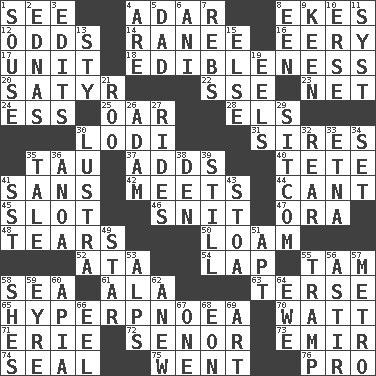 ACROSS 1. Perceive with the eye 4. The sixth month of the Jewish calendar 8. Makes supply last 12. Likelihood 14. Indian princess (variant) 16. Suggestive of the supernatural 17. A single undivided whole 18. The property of being fit to eat 20. Letch 22. Compass dir. 23. Fish or hair follower 24. Curvy letter 25. Rowing implement 28. Raised railways 30. Farming town in central California 31. Titles for men of rank and authority 35. The 19th letter of the Greek alphabet 37. Does sums 40. False hair 41. Without 42. Confronts 44. Patter 45. Groove 46. In a ____ (agitated or irritated) 47. Mouth or opening 48. Lacerates 50. Rich soil 52. "One Day ___ Time" 54. Pet locale 55. Scottish cap 58. Ocean 61. In the manner of 63. Laconic 65. Abnormally rapid or deep breathing 70. Electrical Unit 71. One of the Great Lakes 72. Sir (Sp.) 73. Independent ruler or chieftain 74. Lick closed 75. Gone 76. Adept person DOWN 1. Boozer 2. Ferber et al. 3. Prepares for publication 4. "We ___ not amused" (Victoria) 5. Male parent 6. Black tropical American cuckoo 7. Confederate soldiers (slang) 8. Car or cant ending 9. Peachy ____! 10. Celtic language 11. System (abbr.) 13. Filthy place 15. Otherwise 19. Snakelike fish 21. Friend of Pooh 26. First man 27. Amusement-park features 29. "Cheers" or "Ellen" 30. A period of five years 32. Bring up, as a child 33. Inactive volcano in Sicily 34. Put into a specified state 35. Story 36. Small Philippine buffalo 38. Lair 39. Not moving 41. Fast jet (abbr.) 43. Portico 49. Play the lead 51. Fitting 53. High mountains 55. _____ steamer (cargo ship) 56. Moving or stirring 57. Paris' subway 58. "______ My Girl" (Turtles hit) 59. Jane of fiction 60. Capital of Western Samoa 62. Afresh 64. She-sheep 66. Snakelike fish 67. Single 68. Period of immesurable duration 69. Tate display