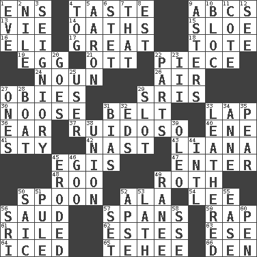 ACROSS 1. Followers of ems 4. Clothes sense 9. Lettered men learn these first 13. Compete 14. Expletives 15. _ gin 16. Connecticut Ivy Leaguer 17. Relatively large 18. Carryall 19. Ovum 21. Baseball player Mel 22. Component 24. Part of speech 26. Wind 27. Off-Broadway awards 29. Indian titles of respect 30. Trap for birds or small mammals 31. Waist strap 33. Pet locale 36. Ewer handle 37. Noisy, rowdy, vocal (Spanish) 40. Compass dir. 41. Filthy place 42. Political cartoonist Thomas 43. Climbing, woody, usually tropical vines 45. The front part of a cuirass 47. Keyboard key 48. Friend of Pooh 49. Writer of Portnoy's Complaint (1969) 50. Soup utensil 52. Insect wing 54. Area sheltered from the wind 56. Saudi Arabian king (1953-1964) 57. Connects, as a bridge 59. Strike 61. Cause heat under the collar 62. _____ Park, CO 63. Compass dir. 64. On the rocks 65. Giggle 66. Lair DOWN 1. First lady 2. Mediterranean tributary 3. Signiory (variant) 4. Coat; cloak 5. Composer Copland 6. Proofreading order 7. Not this but _ 8. Eastern Standard Time (abbr.) 9. Michaelmas daisies 10. Group of countries in special alliance 11. ____ d'Azur (French Riviera) 12. Perceive with the eye 20. Moves 22. Components 23. One more than two 25. One who uses or employs something 27. Singles 28. Water vessel 29. Notch 31. Prejudice 32. Begley and Asner 33. Resembling or made to resemble leather 34. Queen of England 1702-14 35. Lightbulb-shaped fruit 38. The state of being joined or united 39. Margarine 44. International (abbr.) 45. Eaten away 46. Thick or sticky substance 49. Indian princess (variant) 50. Ketch in the Levant 51. Whine 52. Domed church section 53. Thin strip of wood or metal 55. Relaxation 56. _ Lanka 57. Put into a specified state 58. Compass dir. 60. Animal enclosure