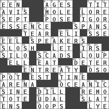 ACROSS 1. Car or cant ending 4. Eons 8. Teat (slang) 11. Advice 13. Undercover agent 14. Old wives' tales, e.g. 15. Back-to-school mo. 16. Introduce or present, as a question 17. Composer Stravinsky 18. Core 21. Connects, as a bridge 22. Pull into pieces 23. Connecticut Ivy Leaguer 25. Compass dir. 26. Snakelike fish 29. Orators 32. Splash clumsily 34. Allow 35. Big collection agency 38. Grain storage tower 39. Oodles 41. Central Nebraska county 43. Pipe bend 44. Consume 45. Prevent from occurring 46. Plea 50. Bear (Spanish) 51. Plant holder 54. Eastern Standard Time (abbr.) 55. Prong on a fork 57. Sports stadium 59. Pertaining to the sea 63. Trig term 64. Deli pickle 67. San ____ (Riviera town) 68. Carry 69. Hereditary estate 70. Narrow board 71. Followers of ems 72. I made a mistake 73. Sodium hydroxide DOWN 1. Relaxation 2. Nights before holidays 3. Pinches, bites 4. Electrical Unit 5. Thick or sticky substance 6. Raised railways 7. Observe 8. Ancient Roman robes 9. Removes the wrinkles 10. Laconic 12. Proofreading order 14. Mouth edge 19. Delicate 20. Head covering 21. Title for a knight 23. Supplemented with great effort 24. Allows 26. Double-curved letter 27. Writer Wiesel 28. Hang loosely or laxly 30. Having winglike extensions 31. Filth; sediment 33. Flatfish 36. Printing process, for short 37. Takes to court 39. Arranges properly for use 40. Haul 42. Adept person 45. Unit of force 47. Teachers' org. 48. Ringlike coral islands and reefs 49. Nervous spasm 51. Thick mixture 52. Constellation of myth 53. Portable shelters 56. Hearing organs 58. Born 60. 1994 drama film starring Jodie Foster 61. "If ____ say so..." 62. ____ d'Azur (French Riviera) 64. Superhero pair 65. Wedding promise 66. Infant locale