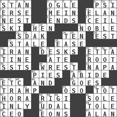 ACROSS 1. Comedian Laurel of Laurel & Hardy 5. Stare at amorously 9. 23rd letter of the Greek alphabet 12. Celtic language 13. Count _ (2 wds.) 14. Style 15. Egg locale 16. Extremities 17. To provide with a ceiling 18. What Jean-Claude Killy likes to do 19. Layer 21. Having high moral qualities 22. Neighbor of Neb. 24. Nine, plus one 26. Eastern Standard Time (abbr.) 27. Having lost freshness 28. Comfort 29. SW Asia republic 30. Writing tables 32. Singer James 36. Prong on a fork 37. Had dinner 38. Carrot, for example 39. Fast planes 40. Obtain by seizing forcibly or violently 42. California wine valley 43. Sliced desserts 44. Remain 46. And so on (abbr.) 49. Also 50. Travels 51. _____ steamer (cargo ship) 53. Bear (Spanish) 54. Small child 57. Israeli folk dance 58. Swiss mountan, "Queen of the Mountains" 61. Not divided or shared with others 62. In an inward manner 63. Hereditary estate 64. Lacquered or enameled metalware 65. Corporate head (abbr.) 66. Immeasurably long periods of time 67. ____ Jay Lerner DOWN 1. Elected reps. 2. Long journey 3. Helper 4. Remaining after all deductions 5. Sign of things to come 6. Commissioned military rank (abbr.) 7. Flaplike covering 8. Followers of ems 9. First-year military academy student 10. Moves on water 11. An arm off of a larger body of water 14. Environmental prefix 19. Actor Linden 20. Made supply last 21. Compass dir. 23. Natives or inhabitants of Denmark 24. Receives possession of 25. Double-curved letter 27. Indian titles of respect 28. _____ Park, CO 29. It is 31. Having ears or earlike features 32. Bert's buddy 33. Inedible or poisonous agaric 34. Drink excessively 35. _ moment's notice (2 wds.) 40. Acquire through effort 41. Labels 43. Infant food 45. Sometimes accompanies a hiss 46. Moral principle 47. Marketplace scale 48. Monte _, Las Vegas Hotel/Casino 52. Can I? 53. Petroleums 55. Water jar 56. Adolescent 58. Regret 59. Wedding promise 60. Separate the seeds from cotton 61. R.R. building