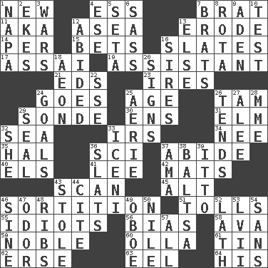 ACROSS 1. ___ Haven, CT 4. Curvy letter 7. Naughty child 11. Alias (abbr.) 12. At sea 13. Wear away 14. For each 15. Stakes 16. Chalkboards 17. Slender Brazilian palm 19. Helper 21. Begley and Asner 23. Angers 24. Leaves 25. Ripen 26. Scottish cap 29. Something which is sent 30. Followers of ems 31. Shade tree 32. Ocean 33. Big collection agency 34. Born 35. Actor Linden 36. _-fi 37. Stay 40. Raised railways 41. Area sheltered from the wind 42. Floor coverings 43. Examine minutely or intensely 45. The first octave above the treble staff 46. Determination 51. For Whom the Bell _____ 55. Foolish or stupid persons 56. Prejudice 58. Actress Gardner 59. Having high moral qualities 60. Water jar 61. Metal container 62. Celtic language 63. Snakelike fish 64. Part of HMS, perhaps DOWN 1. California wine valley 2. Makes supply last 3. Armed conflicts 4. Compass dir. 5. Bristle 6. Backtalk 7. Naughty children 8. Round or rotation of duties 9. An important port of Yemen 10. Trial 12. Tolerated 13. Otherwise 16. Fathers 18. A really long time 20. Public displays of written messages 22. Compass dir. 24. Finish lines 25. Nest on high 26. Watches over 27. Toward shelter 28. Madame (abbr.) 29. Lick closed 32. A female animal or person 33. Ancient Celtic tribe of eastern Britain 36. Narrow boards 37. Nanny (var.) 38. Greek mezzo-soprano Agnes 39. "Tell ____ the Marines!" 43. Fur scarf 44. Quote 46. Trig term 47. Aroma 48. Chest bones 49. Mitch Miller's instrument 50. Mediterranean tributary 52. Thin strip of wood or metal 53. 57 in ancient Rome 54. Without 57. 100%