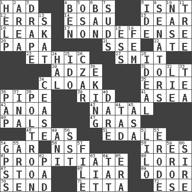 ACROSS 1. Possessed 4. Moves up and down 8. Is not 12. Blunders 14. He sold his birthright 15. Letter starter 16. Path through which fluid escapes 17. Unrelated to defense, as in spending 20. Dad 21. Compass dir. 22. Had dinner 23. Moral principle 27. Stricken, poetically 29. Axlike tool, used for shaping wood 31. Stupid person 34. Loose outer garment 35. 4th largest of the Great Lakes 36. Corncob 39. To free from 41. Toward the sea 42. Small Philippine buffalo 43. Brizilian seaport 46. Friends 47. Pate de foie ____ 48. Afternoon social gatherings 51. Peak District village in England 54. Slender fish 56. Science/research agcy. 58. Angers 61. Appease 66. Australian parrot (variant) 67. Portico 68. One who doesn't tell the truth 69. Scent 70. Post 71. Singer James 72. Compass dir. DOWN 1. Assist 2. Type of rug 3. Window treatment 4. Benjamin's nick name 5. Bear (Spanish) 6. Prohibit 7. Soap bubbles 8. Binary compound 9. Legislators 10. Political cartoonist Thomas 11. Woody plant 13. Three-handed card game 18. Double-curved letter 19. Opposite of masc. 24. Actor Linden 25. Wedding promise 26. Russian ruler of old 28. Perfect 30. Supplementing with great effort 32. Untruth 33. Afternoon social gathering 34. Stop 36. Infant food 37. _ tizzy (2 wds.) 38. Coward 40. Have the gumption 44. Small boy 45. White ___ sheet 49. Black tropical American cuckoo 50. Fast jet (abbr.) 52. _ and Stitch 53. Eat (away) 54. Global Positioning Systems (abbr.) 55. Johnson of "Laugh-In" 57. Do some clerical work 59. Greek god of love 60. Title for a man of rank and authority 62. Groovy apt. 63. Small island 64. Make lace 65. Period