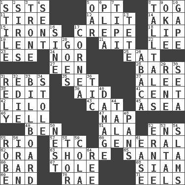 ACROSS 1. Fast planes 5. Elect 8. Coat; cloak 11. Become fatigued 12. Set down 14. Alias (abbr.) 15. Removes the wrinkles 17. Streamer paper 18. Mouth edge 19. Small, flat, pigmented spot on the skin 21. Small island 22. Area sheltered from the wind 23. Compass dir. 24. Not either 25. Erode 27. Car or cant ending 28. Long, evenly shaped pieces 31. Confederate soldiers (slang) 35. Put into a specified state 37. Toward shelter 38. Prepare for publication 39. Help 41. Penny 42. _ and Stitch 43. Domesticated feline 45. At sea 46. Shout 47. Atlas unit 49. Benjamin's nick name 51. In the manner of 52. Followers of ems 55. River (Sp.) 57. And so on (abbr.) 60. Commissioned military rank 62. Mouth or opening 63. Dinah or Pauly 65. Before Barbara or Clara 66. Soap unit 67. Lacquered or enameled metalware 68. Thailand, formerly 69. Conclusion 70. Actress Charlotte 71. Snakelike fish DOWN 1. Vertical member of a panel or frame 2. Fathers 3. Heavy duty weighing machine 4. Emitted 5. Boat paddle 6. Entreaty 7. Native american tent (variation) 8. Baron Munchausen's specialties 9. Migrant worker of the '30s 10. Yawn 13. Wig 16. Trig term 17. Pupil covering 20. Travels 26. Phillipine bananalike plant 29. French philosopher Descartes 30. Stalk of a moss capsule 31. Trust 32. Singer Brickell 33. Big road sign 34. Took without asking 36. Nervous spasm 40. Break 44. Story 48. Baking dishes 50. A home for chicks 52. Bert's buddy 53. Brizilian seaport 54. Criticizes harshly 55. Loose flowing garment 56. SW Asia republic 58. Son of Odin 59. Root beer relative 61. Relaxation 64. To separate or throw off