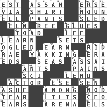 ACROSS 1. Eastern Standard Time (abbr.) 4. Indian state 9. Celtic language 13. By way of 14. Chest covering 15. Part of speech 16. Pipe bend 17. Leg coverings 18. Downhill vehicle 19. Shade tree 21. Portuguese money of account (variant) 22. Cements 24. Frog relative 26. Area sheltered from the wind 27. Memorize 29. Arranges properly for use 30. Stared at amorously 31. Merit 33. To free from 36. Actress Charlotte 37. Talking persistently and meaninglessly 40. Epoch 41. Begley and Asner 42. Oceans 43. Slender Brazilian palm 45. Pismires 47. Aches 48. _-fi 49. Grant temporary use of 50. Thespian 52. Compass dir. 54. Elected rep. 56. American tennis player Robert 57. Amid 59. Lower and raise head in agreement 61. Separate forcefully 62. Ms. Damita and namesakes 63. Corporate head (abbr.) 64. Hearing organs 65. Sports stadium 66. Raised railways DOWN 1. Night before a holiday 2. Drop; flow; fall 3. Baron Munchausen's specialties 4. Cleo's killer 5. Broken piece 6. Trig term 7. Johnson of "Laugh-In" 8. Mountains (abbr.) 9. Takes place subsequently 10. Hero or heavy, e.g. 11. Institutes legal proceedings 12. Conclusion 20. Greater amount 22. American astronaut and politician John 23. Allow 25. Actor Griffith 27. Old wives' tales, e.g. 28. Mild oath 29. Indian titles of respect 31. Makes supply last 32. Alias (abbr.) 33. Dwelling 34. SW Asia republic 35. Raised platform 38. Being in motion 39. Stare wonderingly 44. Without 45. Michaelmas daisies 46. Non-commissioned officer (abbr.) 49. Soviet premier 1918-24 50. Toward the sea 51. Burn to charcoal 52. Independent ruler or chieftain 53. Not divided or shared with others 55. Christmas carol 56. Had dinner 57. Wing 58. Girls' org. (abbr.) 60. Two (Sp.)