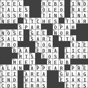 ACROSS 1. Stitch closed the eyes of (a falcon) 5. Confederate soldiers (slang) 9. Indiana (abbr.) 12. Lies 14. Butter sub 15. Actress Charlotte 16. NE Netherlands city 17. Airtight sealed metal containers 18. _ tizzy (2 wds.) 19. Born 20. Strong, restless desires 23. Russian ruler of old 24. Coast Guard woman 25. Brightly colored fish 27. Sense of smell 30. Unit of force equal to gravity 32. Not either 33. Table seasoning 34. Indian skirt 36. Call ___ day 38. Back 39. Coat; cloak 40. Compete 43. Sound made by sheep 46. Pulitzer Prize-winning author Ferber 48. Louse (plural) 49. Mountains (abbr.) 51. Greek goddess of the dawn 52. An important port of Yemen 53. Confront 54. Reuben's nickname 56. ____ Jay Lerner 58. Become visible 61. Before (prefix) 64. Flowery wreath 65. Length times width 66. POW camp 68. Conclude 69. Welt 70. 1973 Nobel Price Winner (Physics) Leo 71. Music discs 72. Blunders 73. Snake ____ (dice throw) DOWN 1. Comedian Laurel of Laurel & Hardy 2. Comfort 3. Otherwise 4. Area sheltered from the wind 5. Writer of Portnoy's Complaint (1969) 6. Writer Wiesel 7. Gillaume's butler role 8. Mayday 9. From or relating to Ireland 10. Nanny 11. Letter starter 13. Clip 21. Labels 22. Make 23. Small pie 24. Arrange properly for use 26. Luau course 27. Science/research agcy. 28. Boat paddle 29. Oscar Madison type 31. Eat (away) 35. Snub 37. Enthusiastic 41. Frozen water 42. Car or cant ending 44. So be it 45. Had dinner 47. Toward the sea 48. Experiment locale 50. A viewer who gazes fixedly 53. Women servants 55. Goad 56. Actor Baldwin 57. Grant temporary use of 59. Lightbulb-shaped fruit 60. Friends 61. Frolic 62. Libertine 63. The front part of a cuirass 65. Deep reverence 67. Purpose