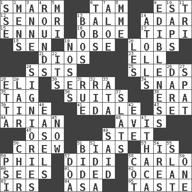 ACROSS 1. Excessive but superficial compliments 6. Scottish cap 9. Eastern Standard Time (abbr.) 12. Sir (Sp.) 13. Lip ointment 14. The sixth month of the Jewish calendar 15. World-weariness 16. Mitch Miller's instrument 17. Native american tent (variation) 18. Elected rep. 19. Sense of smell 20. Tennis shots 21. "Vaya con ____" 23. Pipe bend 24. Fast planes 25. Bobsleighs 28. Biblical high priest 30. Spanish missionary in California 34. Fastener 35. Label 36. Sets or collections 38. Epoch 39. Prong on a fork 41. Peak District village in England 43. Put into a specified state 44. Believer in; advocate of (suffix) 46. Advice 48. Bear (Spanish) 49. Proofreading order 50. Group working together 51. Prejudice 53. Part of HMS, perhaps 56. Silvers or Donahue 57. "You Light Up My Life" star Conn 58. Monte _, Las Vegas Hotel/Casino 60. Perceives with the eye 61. Wrote a lyric poem 62. Sea 63. Big collection agency 64. White ___ sheet 65. Clothes sense DOWN 1. Compass dir. 2. Not women's 3. Queen of England 1702-14 4. Periods in a boxing match 5. Medical imaging device (abbr.) 6. Bar bills 7. Medicinal plant 8. Madame (abbr.) 9. The property of being fit to eat 10. Plant excrements 11. Three (prefix) 13. Scornful sounds 14. Ringlike coral islands and reefs 19. Olfactory organs 20. French article 22. ___ a Wonderful Life 24. Seigniories (variant) 26. Have the gumption 27. Argument over a trivial matter 28. Singer James 29. Den 31. Sorrow 32. To free from 33. _ moment's notice (2 wds.) 37. Narrow boards 40. Artist's stands 42. First lady 45. At this time 47. New York city 49. Expressed in words 50. "Mermaids" star 51. Auction offers 52. It may be bright or harebrained 54. Angers 55. Narrow board 56. 23rd letter of the Greek alphabet 57. ___ good deed 58. Small bed 59. Single