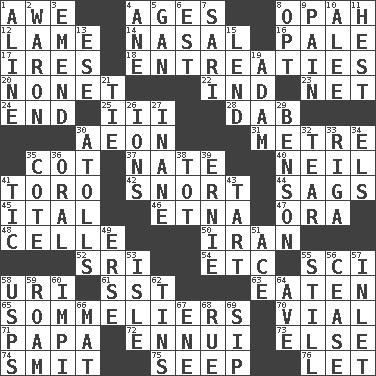 ACROSS 1. Deep reverence 4. Eras 8. Brightly colored fish 12. Unable to walk 14. Rhinal 16. Light colored 17. Angers 18. Pleas 20. Music written for nine 22. Working for oneself (abbr.) 23. Fish or hair follower 24. Conclude 25. One more than two 28. Small moist lump or mass 30. A really long time 31. Distance measurement (Brit.) 35. Small bed 37. Nathan's nickname 40. Famous astronaut Armstrong 41. "Corrida" creature 42. Derisive sound 44. Sinks 45. Slanted text style (abbr.) 46. Inactive volcano in Sicily 47. Mouth or opening 48. Cell (Danish) 50. SW Asia republic 52. Indian title of respect (Mr.) 54. And so on (abbr.) 55. _-fi 58. RI univ. 61. Fast jet (abbr.) 63. Consumed 65. Wine waiters 70. Small bottle 71. Dad 72. World-weariness 73. Otherwise 74. Stricken, poetically 75. Ooze 76. Allow DOWN 1. Place in a line 2. Make _____ (do battle with) 3. Make improvements or corrections to 4. A saturated hydrocarbon 5. Separate the seeds from cotton 6. Eastern Standard Time (abbr.) 7. Indian skirt 8. Elect 9. Ache 10. Toward shelter 11. Command 13. Compass dir. 15. Grant temporary use of 19. First of billions? 21. Neckwear 26. Charged atoms 27. Silly 29. Gillaume's butler role 30. Ringlike coral islands and reefs 32. Rend 33. Capital of Latvia 34. Raised railways 35. ____ d'Azur (French Riviera) 36. Spoken 38. Small child 39. Bert's buddy 41. Nervous spasm 43. Small pie 49. Celtic language 51. Adept person 53. Small island 55. Free of sound 56. Desist 57. An arm off of a larger body of water 58. United States Postal Service (abbr.) 59. Wander 60. Body of Kaffir warriors 62. Airtight sealed metal containers 64. "___ Maria" 66. Floor protector 67. Compass dir. 68. Regret 69. Small drink