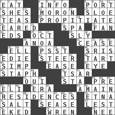 ACROSS 1. Consume 4. Information 8. Sweet dark-red dessert wine 12. "______ My Girl" (Turtles hit) 14. Person of subnormal intelligence 16. A type of plum 17. Beverages made from leaves 18. Conciliate 20. Having ears or earlike features 22. Health resort 23. Avid follower 24. Begley and Asner 25. Sep. follower 28. Wily 30. Small Philippine buffalo 31. Stop 35. Pipe bend 37. Inconspicuous attention getter 40. Indian titles of respect 41. Singer Brickell 42. Guide 44. Small pie 45. Simple or foolish person 46. Comfort 47. Sight organ 48. Staphylococcus 50. Russian ruler of old 52. Fr. "Yes" 54. R.R. building 55. Before (prefix) 58. Connecticut Ivy Leaguer 61. Period 63. At full speed 65. Homes 70. Inactive volcano in Sicily 71. Table seasoning 72. Gospel singer Marvin 73. For fear that 74. Supplemented with great effort 75. Songbird 76. Born DOWN 1. First name in cosmetics 2. At or in the front 3. Lacerates 4. Mischievous child 5. Not either 6. Back 7. I made a mistake 8. Air pressure measure (abbr.) 9. Norwegian king 10. Round or rotation of duties 11. Adolescent 13. Compass dir. 15. Pinches, bites 19. Baby powder 21. Spanish title 26. 911 reaches them 27. Clothes sense 29. Last 30. City in Syria 32. Like ___ of sunshine 33. Title for a man of rank and authority 34. Eastern Standard Time (abbr.) 35. Prepare for publication 36. Pale green bean 38. Ocean 39. Trials 41. Curvy letter 43. State of inaction 49. Became colored 51. Auto club (abbr.) 53. Angers 55. Eucharist need 56. Remove soap 57. Maternal 58. Celtic language 59. Path through which fluid escapes 60. Small island 62. Afresh 64. Cartoonist voice _ Blanc 66. It would 67. Auto 68. Compass dir. 69. Elected rep.