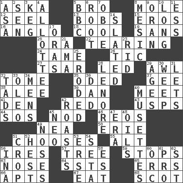 ACROSS 1. "____ silly question..." 5. Sis' sibling 8. Undercover agent 12. Stitch closed the eyes of (a falcon) 13. Moves up and down 15. Greek god of love 16. White American of non-Hispanic descent 18. Calm and collected 19. Without 20. Mouth or opening 22. Pulling into pieces 24. Docile 26. Nervous spasm 27. Russian ruler of old 28. Directed 29. Leather borer 32. Heavy book 35. Wrote a lyric poem 37. Turn to the right 38. Toward shelter 39. Daniel's nick name 40. Rendezvous 41. Lair 42. Do over again 43. United States Postal Service (abbr.) 44. Mayday 45. Lower and raise head in agreement 46. Vintage cars 49. Teachers' org. 50. One of the Great Lakes 51. Elects 55. The first octave above the treble staff 56. Angers 57. Relationship diagram 59. Obstructs or blocks passage 63. Sense of smell 64. Fast planes 65. Blunders 66. Flats, for short 67. Consume 68. Native of Scotland DOWN 1. White ___ sheet 2. Elected rep. 3. Cask 4. One to whom something is allotted 5. English channel? 6. Carrot, for example 7. Mitch Miller's instrument 8. Of or pertaining to a meson 9. NW Algerian seaport 10. Having great length 11. Curvy letter 14. Scheduled 17. Mouths or openings 21. Nursemaid (var.) 23. To free from 25. Worn away 28. Poe poem 29. Eons 30. Shed a tear 31. Allows 32. Bits 33. Butter sub 34. Not women's 36. Male parent 40. French bagpipes 42. Cooks with dry heat, as in an oven 45. Modern: prefix 47. Period 48. Lubricates 49. Olfactory organs 51. Riding implement 52. Command 53. Celtic language 54. Stalk of a moss capsule 56. _ tizzy (2 wds.) 58. Eastern Standard Time (abbr.) 60. The grampus (Milton) 61. Adept person 62. Fast jet (abbr.)