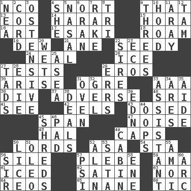 ACROSS 1. Non-commissioned officer (abbr.) 4. Derisive sound 9. Not this but _ 13. Greek goddess of the dawn 14. Ethiopian city, capital of Harari 15. Israeli folk dance 16. Nonscientific branch of learning 17. 1973 Nobel Price Winner (Physics) Leo 18. Wander 19. Morning condensation 21. A saturated hydrocarbon 22. Morally degraded 24. Actress Patricia 26. Frozen water 27. Trials 29. Greek god of love 30. Ascend 31. Legendary monster 33. American Automobile Association (abbr.) 36. HTML Container Element 37. Contrary to your interests or welfare 40. _ Lanka 41. Observe 42. Snakelike fish 43. Administered medicine 45. Connect, as a bridge 47. Annoying sound 48. Actor Linden 49. Balmoral and tarboosh 50. Domineers 52. White ___ sheet 54. R.R. building 56. Filth; sediment 57. Cadet 59. Nursemaid (var.) 61. On the rocks 62. Smooth fabric 63. And not 64. Vintage cars 65. Silly 66. Nervous spasm DOWN 1. Teachers' org. 2. Drawstring 3. Clearly or manifestly demonstrative 4. A female animal or person 5. Relating to the nose 6. Northwest Algerian city 7. Immoral or dissolute person 8. Three (prefix) 9. Threesomes 10. Parka part 11. Like ___ of sunshine 12. Scottish cap 20. Soaks 22. Fathers 23. Environmental prefix 25. At sea 27. Small boys 28. One of the Great Lakes 29. Blunders 31. Baking chamber 32. Set 33. Aide 34. Ancient Greek god of war 35. Assistant 38. Allots cards 39. Pulitzer Prize-winning author Ferber 44. I made a mistake 45. Tears up 46. Writing tablet 49. Apartment or room in a ship 50. Louse (plural) 51. Butter sub 52. ____ Jay Lerner 53. Bristle 55. Mine, in Marseilles 56. Title for a knight 57. 23rd letter of the Greek alphabet 58. Compass dir. 60. Curve