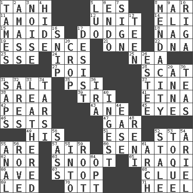 ACROSS 1. Hyperbolic tangent 5. French article 8. Make imperfect 11. Mine, in Marseilles 12. A single undivided whole 14. Biblical high priest 15. Unmarried girls 17. Evade 18. Tired old horse 19. Gist 21. Single 22. Heredity factor (abbr.) 23. Compass dir. 24. Big collection agency 25. Teachers' org. 27. Luau course 28. Go away! 31. Table seasoning 35. 23rd letter of the Greek alphabet 37. Prong on a fork 38. Length times width 39. Three (prefix) 41. Inactive volcano in Sicily 42. Lightbulb-shaped fruit 43. A saturated hydrocarbon 45. Sight organs 46. Fast planes 47. Slender fish 49. Part of HMS, perhaps 51. Compass dir. 52. R.R. building 55. "We ___ not amused" (Victoria) 57. Wind 60. Legislator 62. And not 63. Snob 65. Resident of Iraq 66. "___ Maria" 67. Cease 68. A slight indication 69. Directed 70. Baseball player Mel 71. Person who is morally reprehensible DOWN 1. Corrects by punishment or discipline 2. Collect or gather 3. Annoying sound 4. Flintstone garb 5. Nilotic language 6. Inside; within (prefix) 7. Public display of a written message 8. Ananias' fault 9. Actor Alda or Thicke 10. Capital of Latvia 13. Adolescent 16. Clip 17. Stop 20. Riding implement 26. First name in cosmetics 29. Singer Murray 30. Beverages made from leaves 31. Plant excrements 32. Ancient Greek god of war 33. Resembling or made to resemble leather 34. Tarsus (plural) 36. Retirement account (abbr.) 40. Consume 44. Relaxation 48. Painter Guido (1575-1642) 50. Backtalk 52. Lacking originality or spontaneity 53. Woman's close-fitting hat 54. Satellite of Uranus 55. Of or related to the anus 56. Be footloose 58. To the inside or interior of 59. Carrot, for example 61. Bowlike part 64. Choose